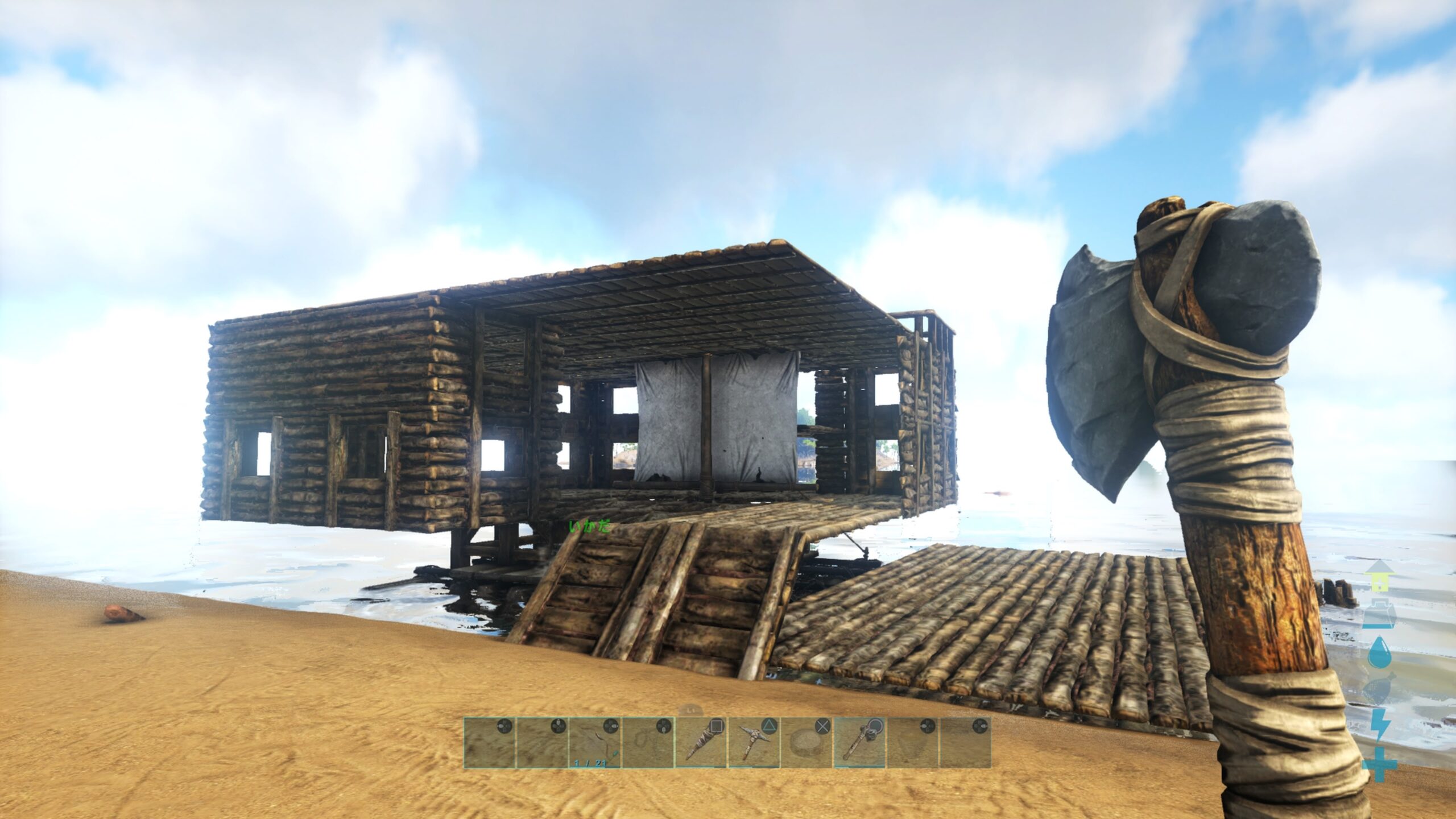 基本の筏は小さくて粗末だが、建築物が作れるというので土台を敷いて部屋を作ってみた。