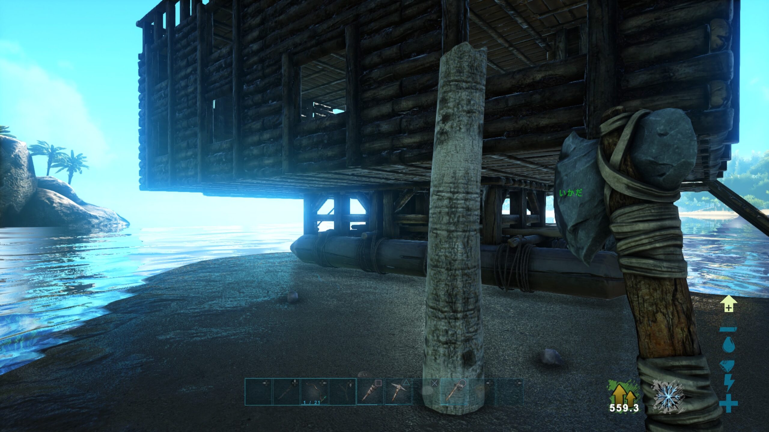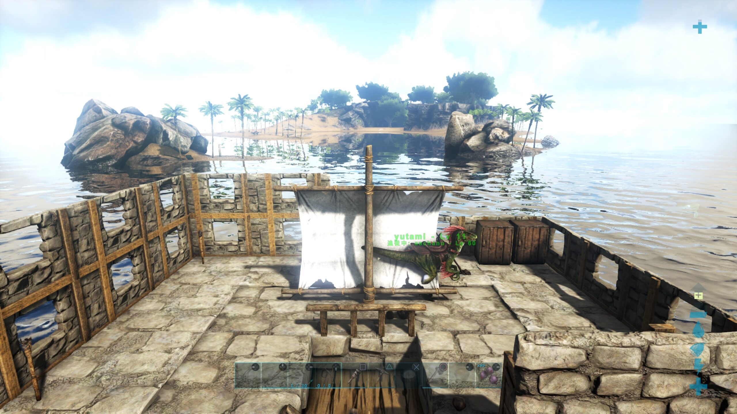 本拠地に余った素材をため込んでたのもあるし、この島でうっかり死んだときに筏もこっちに着けてあると来るのが大変そうなので、必要物資とベッドをとりに一度本拠地に変えることにした。