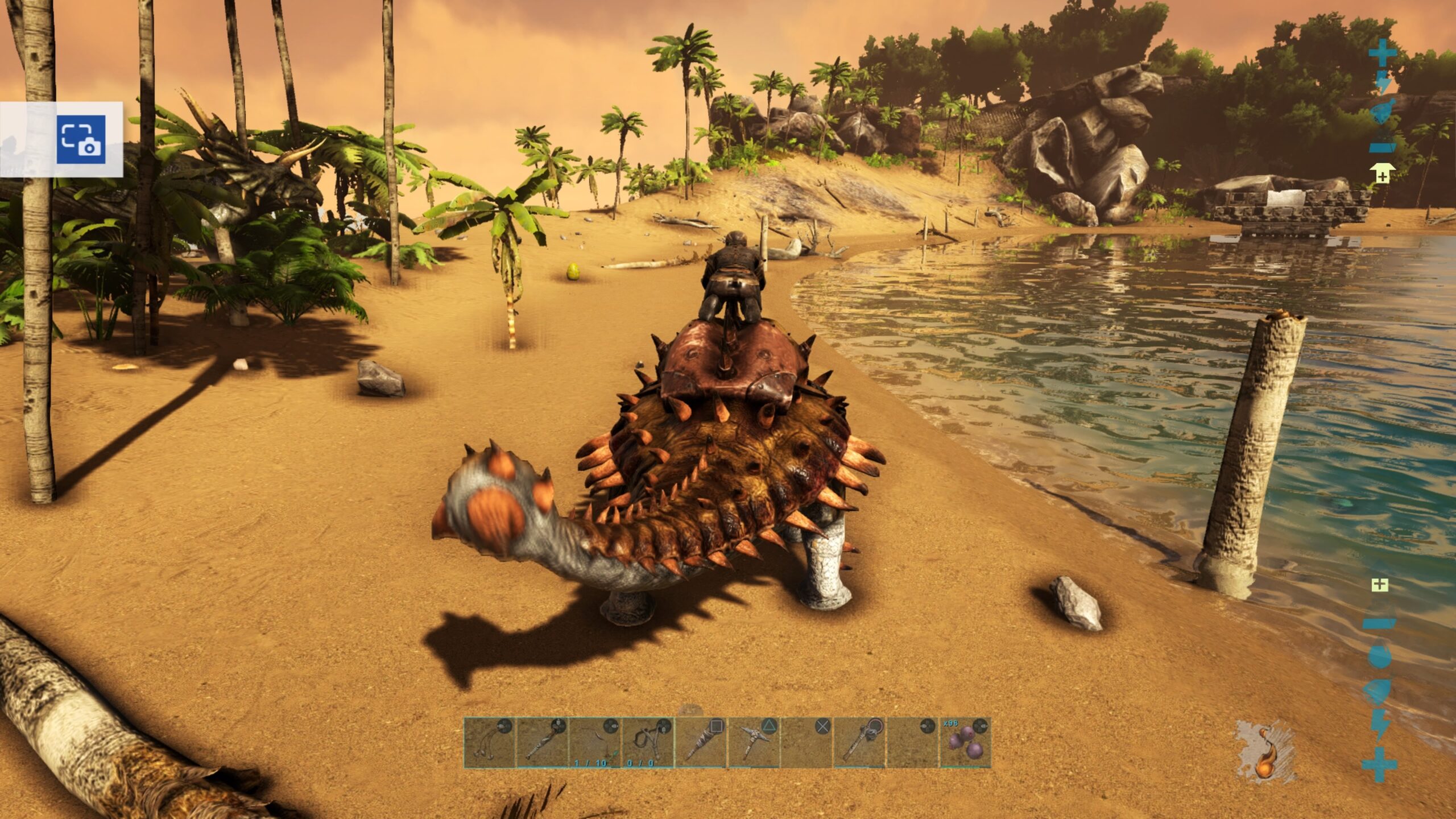 山の中腹で木と木の間に勝手にはまって動けなくなってるアンキロサウルスを発見してさっそくテイム!