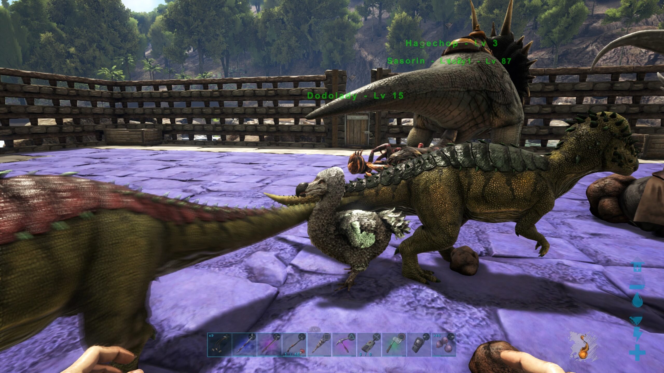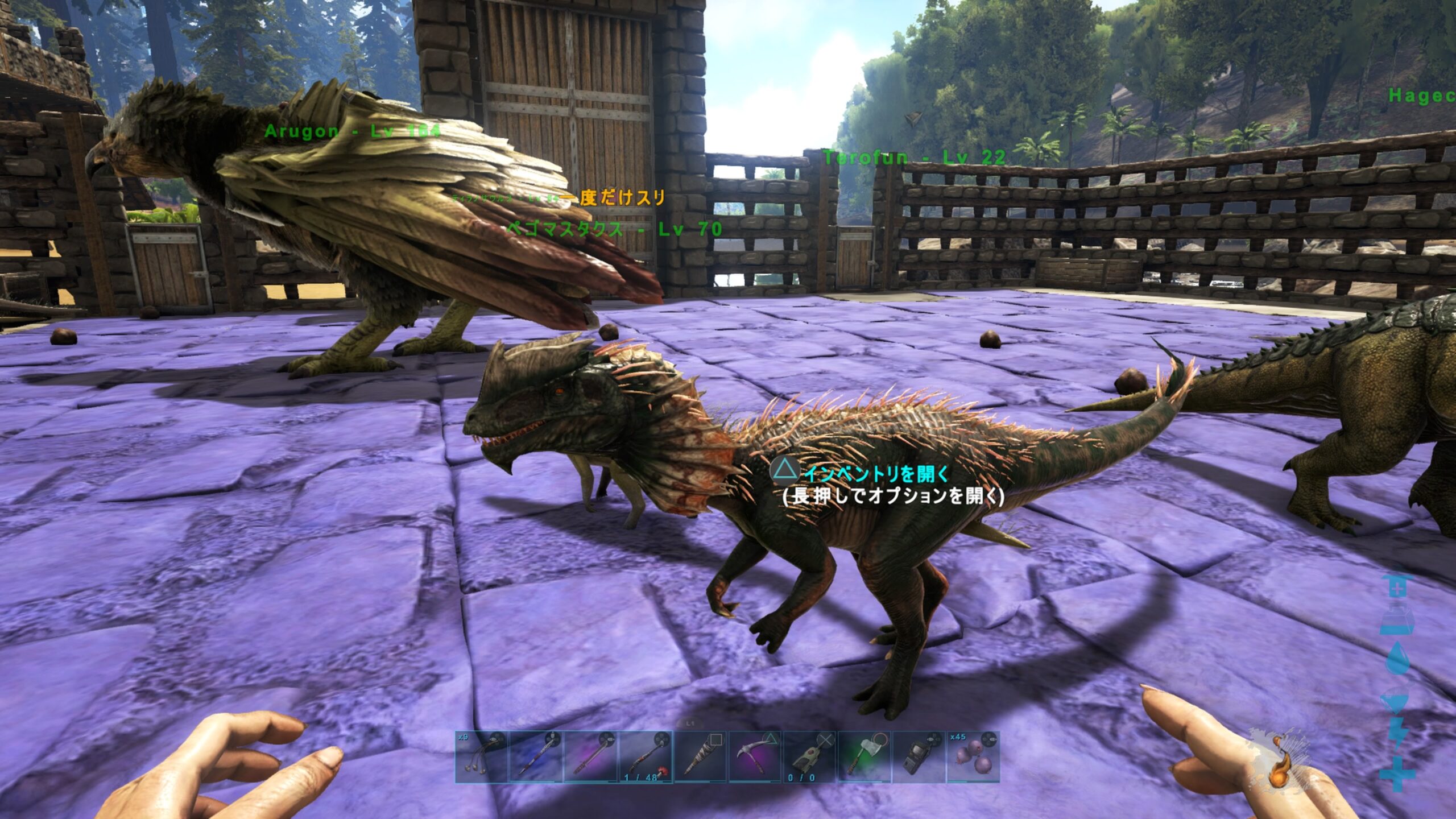 戦力系とお役立ち系恐竜たちはしっかりした小屋に入れているけど、キブル用の卵集め用となんとなくテイムしちゃったけど使い道がいまのところない子たちはお外の柵牧場へ。