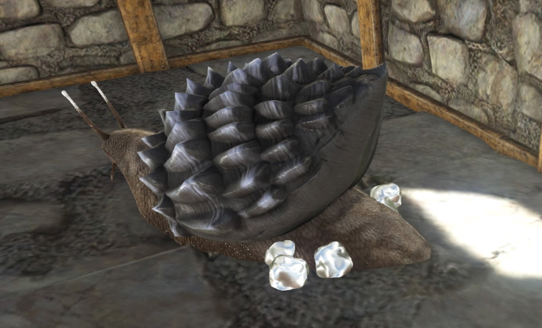同じ島でちょうど拠点の真逆にぐるりとまわりこんだところだったので、森の中を突っ切ってショートカットしようとしたら、マイマイみっけ♪