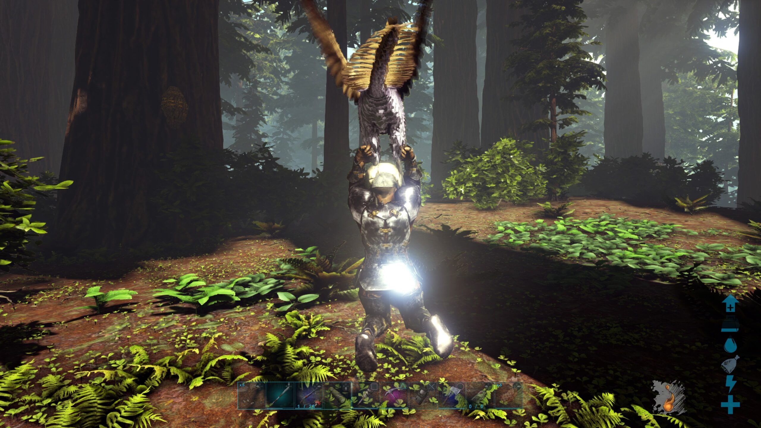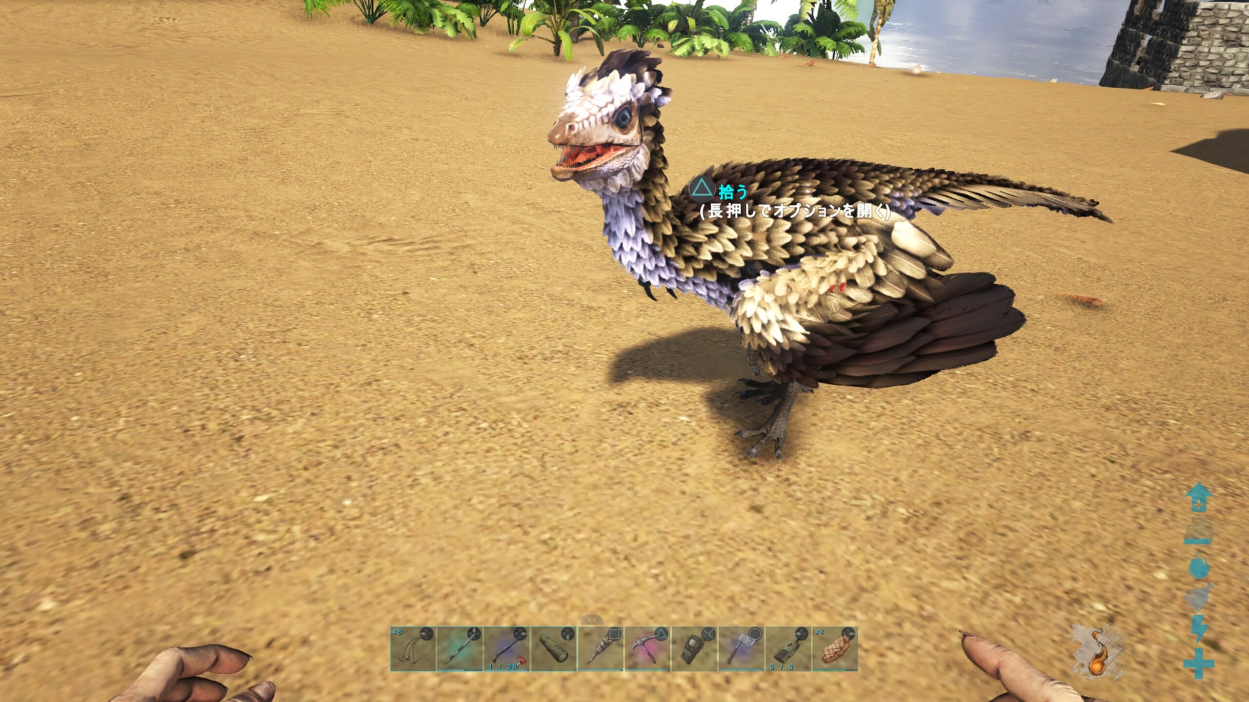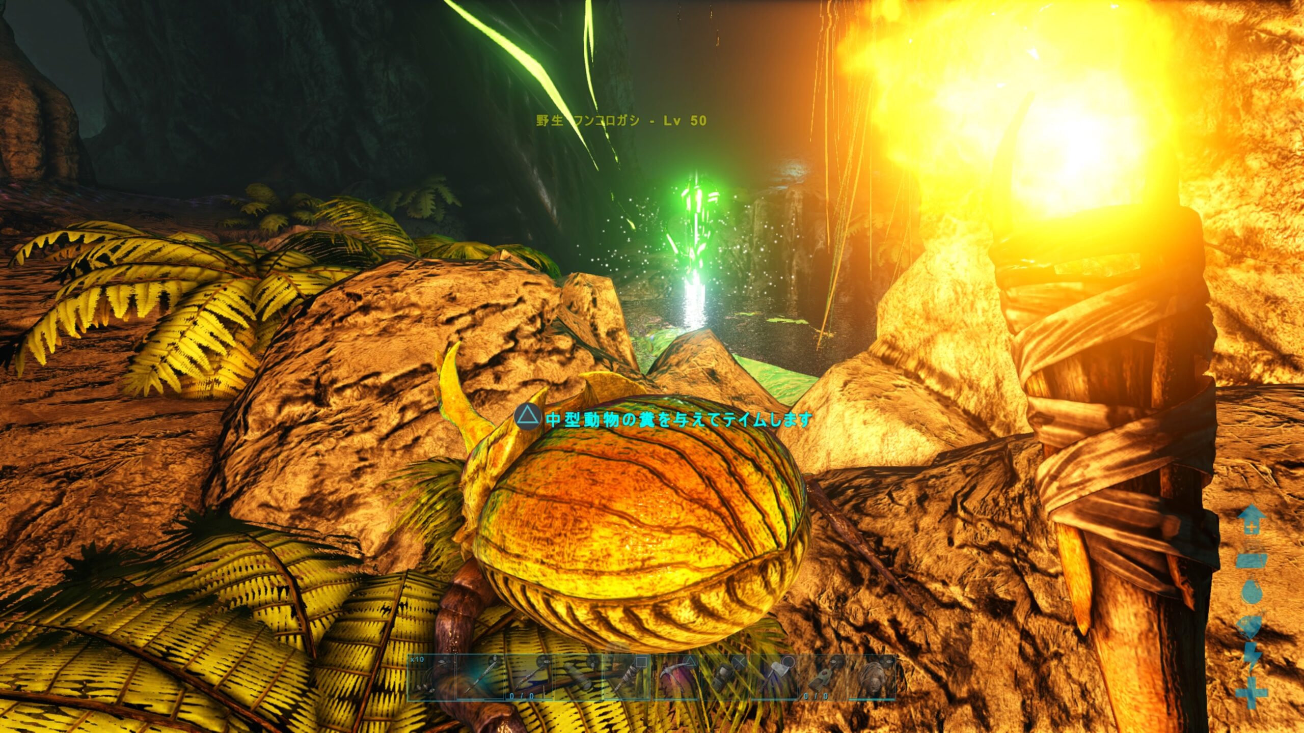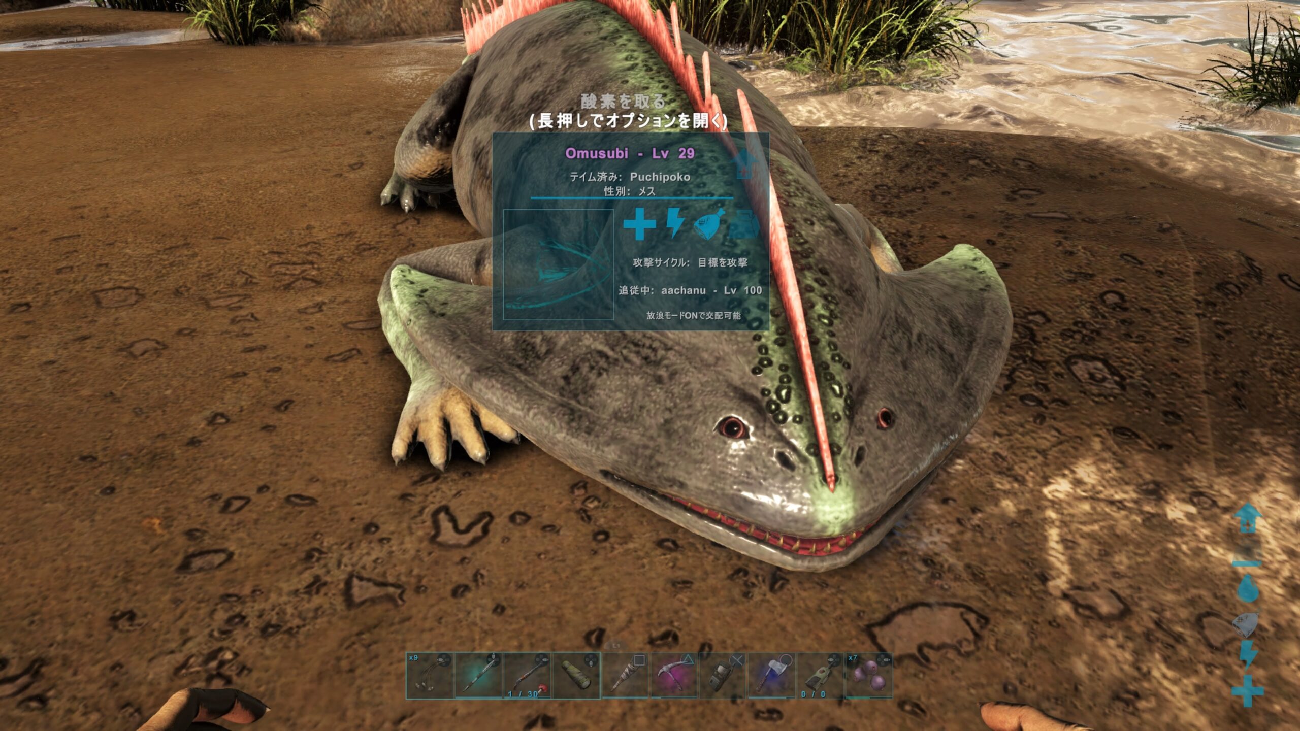 西側の沼の岸辺にあがるところを発見し、周囲のヘビやらワニやらエリマキくんやら掃除したところでボーラで足止めして掃除で手に入れた霜降り肉でテイム!