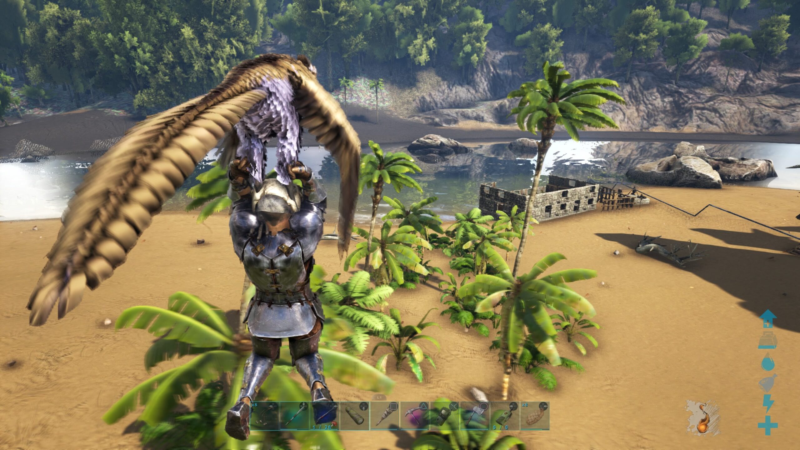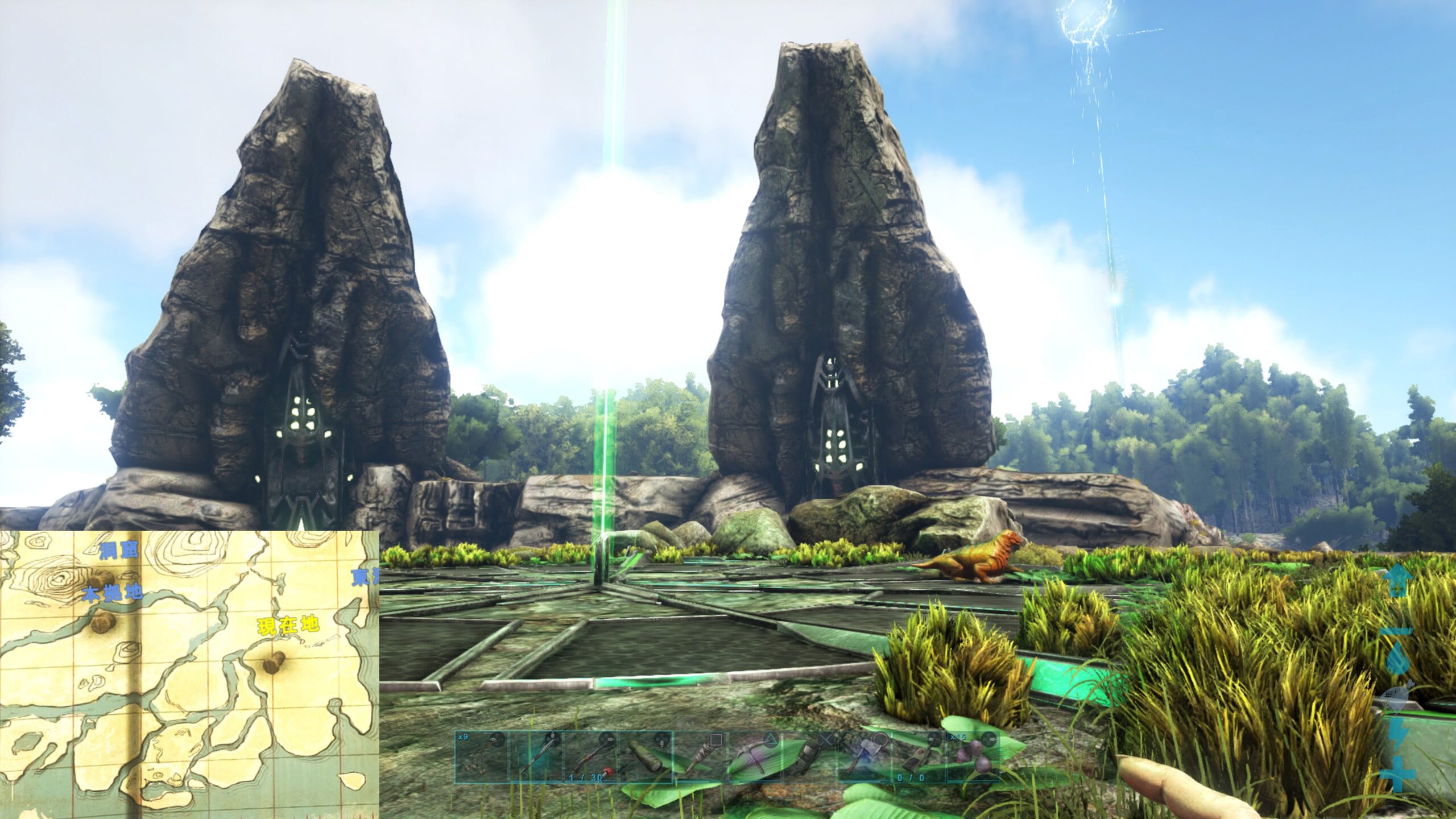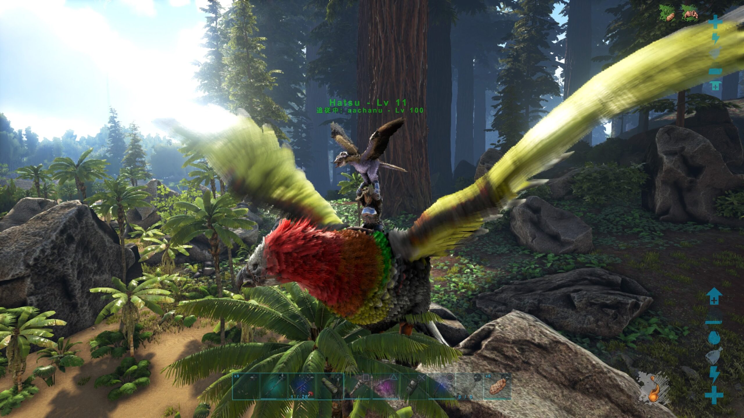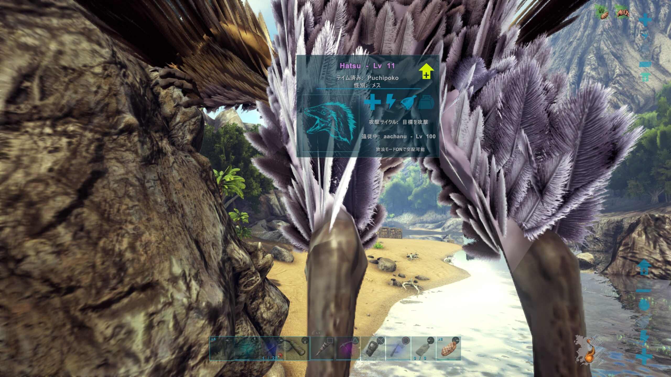 とりあえず川ツアーでぐるりとまわってディプロカウルスを東海岸拠点に置いてから本拠点に戻ってきたところで、サイトーさんに肩車されながら泥棒ペゴマを肩車して一番近い洞窟に遊びに行ってみた。