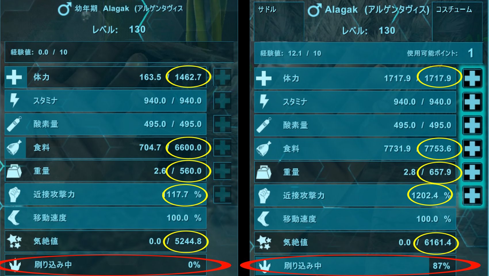 大人になるまでの時間と世話の間隔のせいで100%まではいけませんでしたが、左が生まれた時のステータス、右が成時のステータスとなりました。ふむ。成長率はこんなもんか。