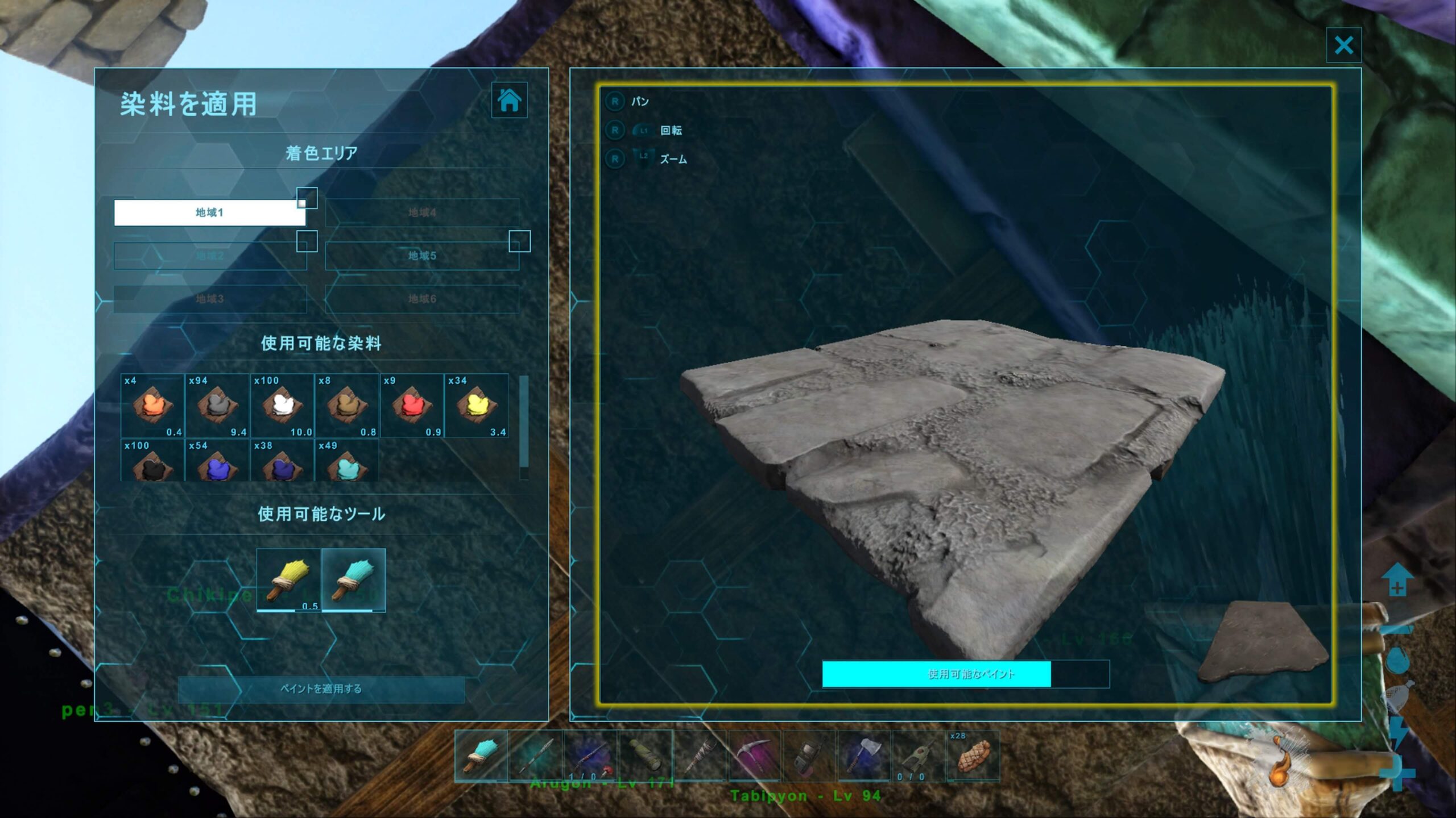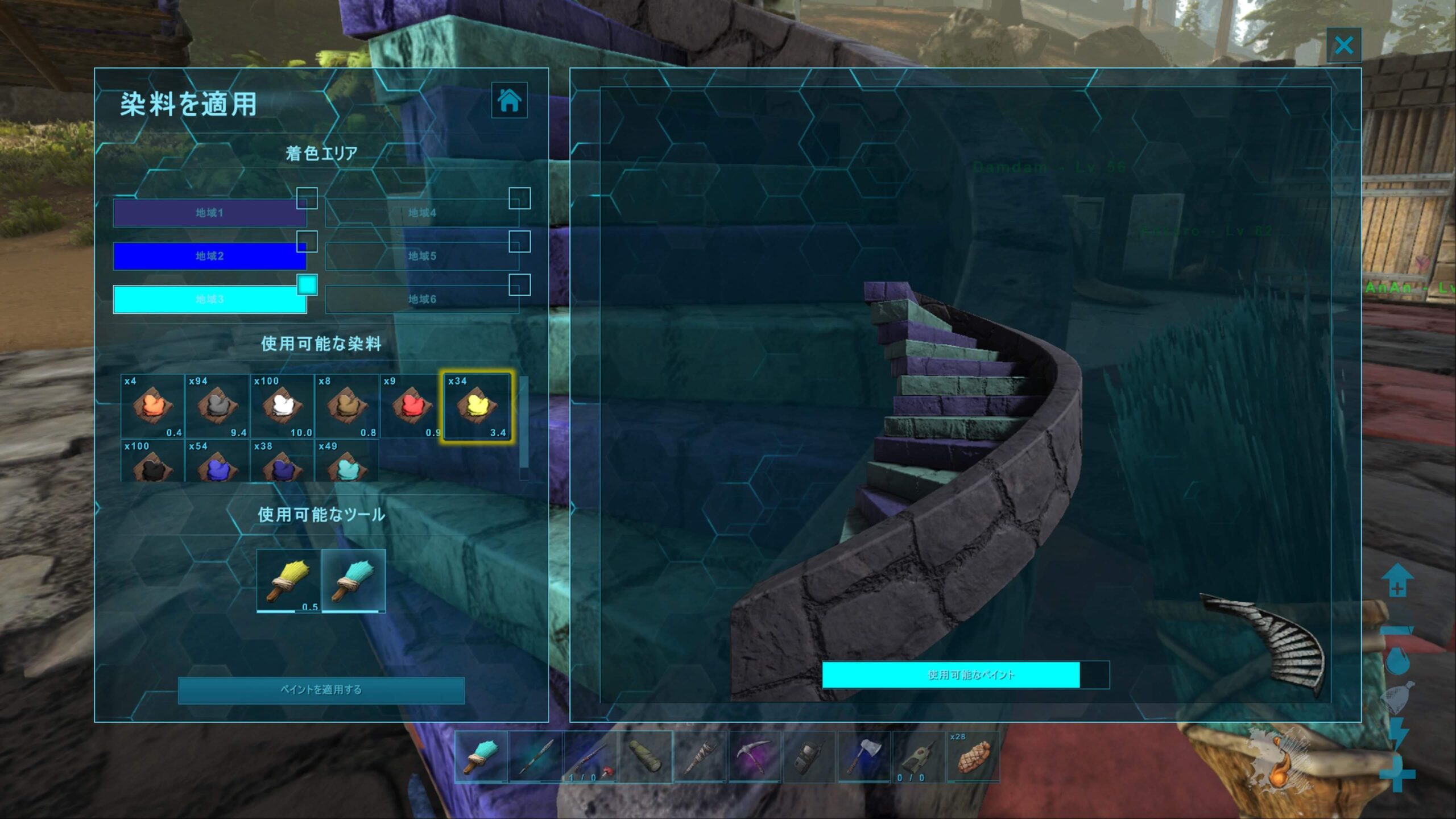 地域番号右上の小さな四角でプレビュー、ダブルクリックするか「ペイントを適用する」ボタンで確定される模様(染料が消費される)。