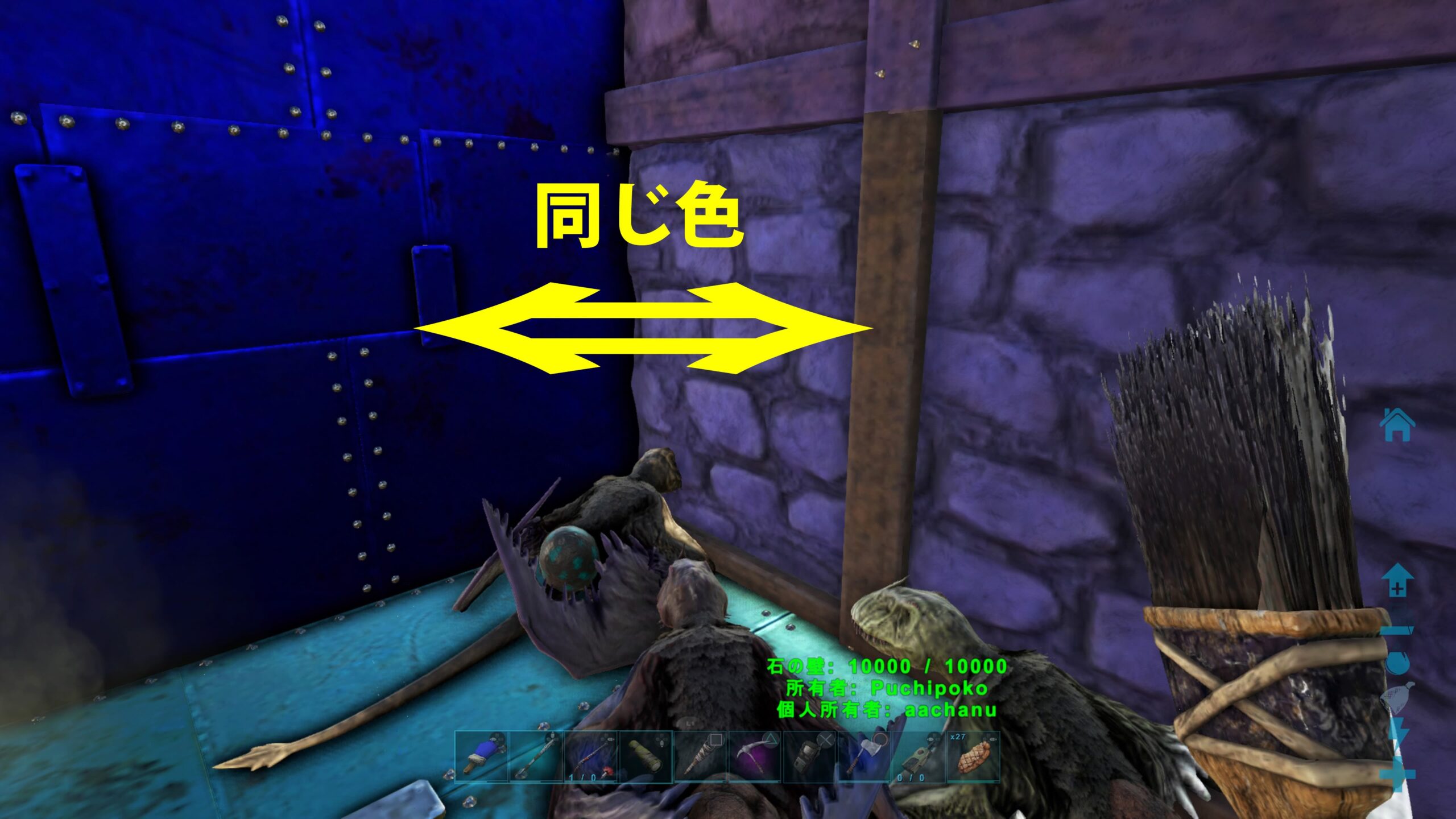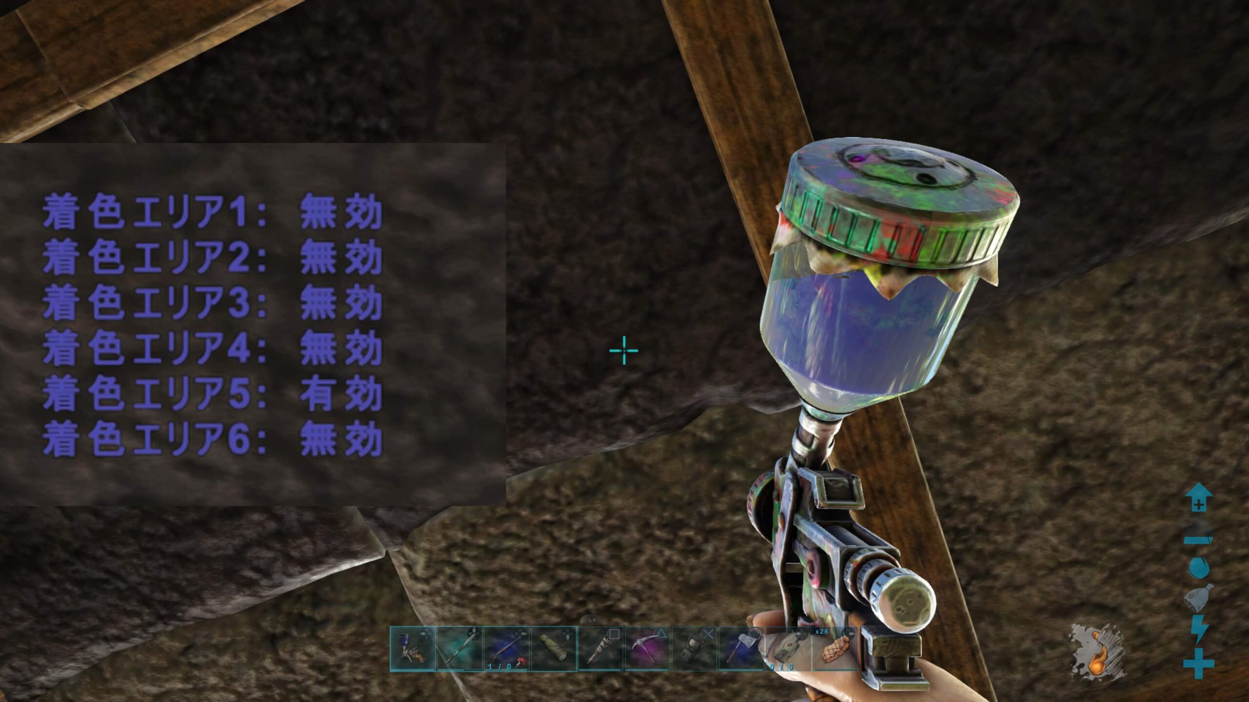 メリット:一度着色エリアをセッティングすると、同じ色を使っている限り同じ形状の建築物に連続して同じ位置にスプレーできるので、建物の壁や床など広範囲を同じ色にしたいときに便利。