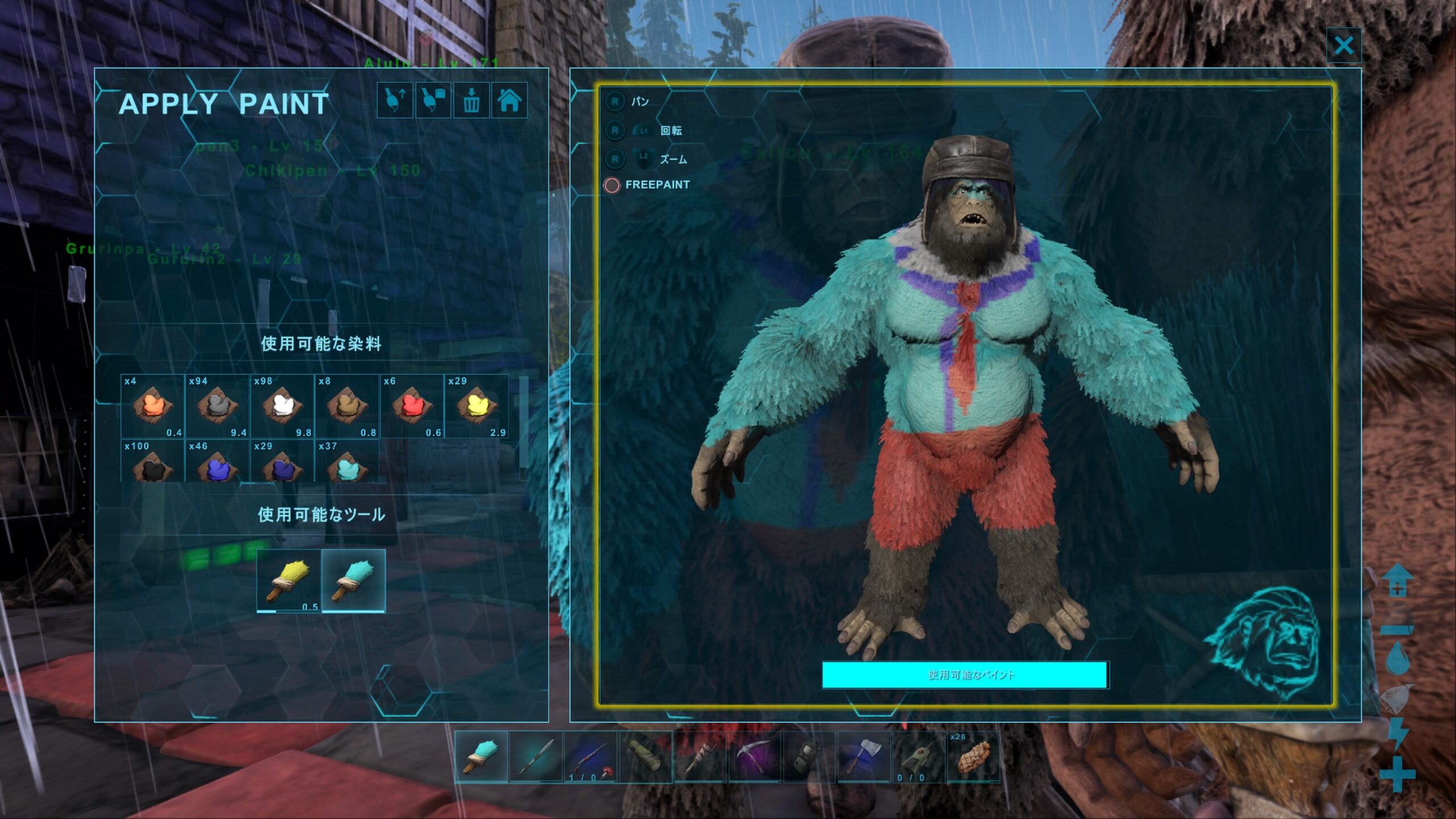 建物のようにマテリアル分けがされていないようで、「フリーペインティング」という特殊なフリーハンド塗りとなるので個性も出しやすい反面PS4の操作性の悪さがめっちゃ響く。これはマウスやペンが使えた方が有利だと思うなぁ。