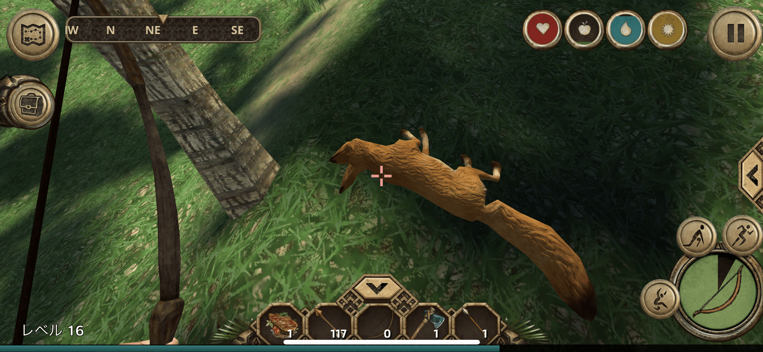 私は序盤「長槍」最強と踏んだが、最初に狩れる動物の逃げ足が異様に早いので、かなりの遠距離まで可能な弓が万能だった。