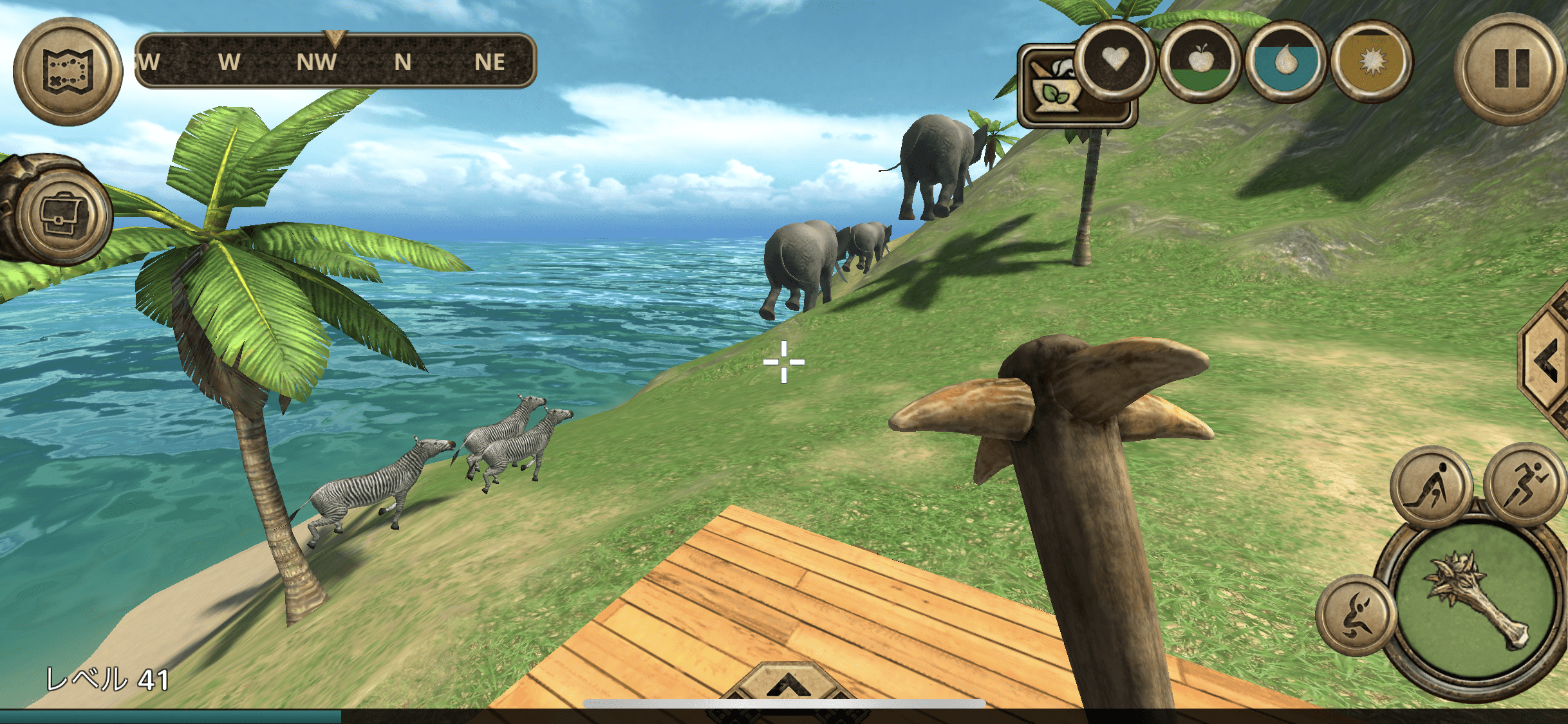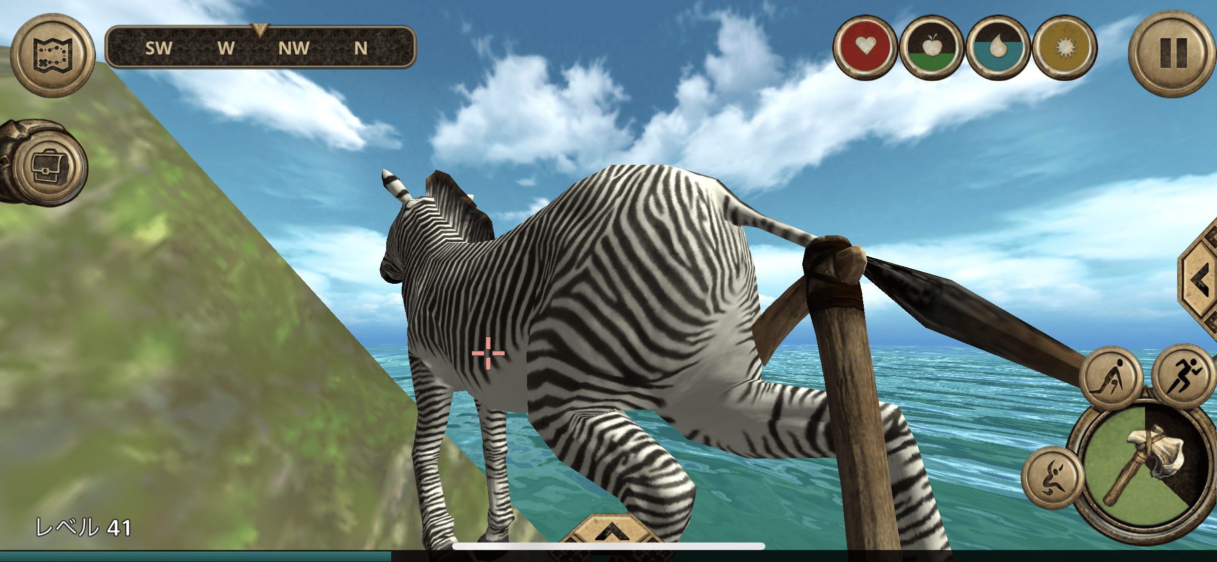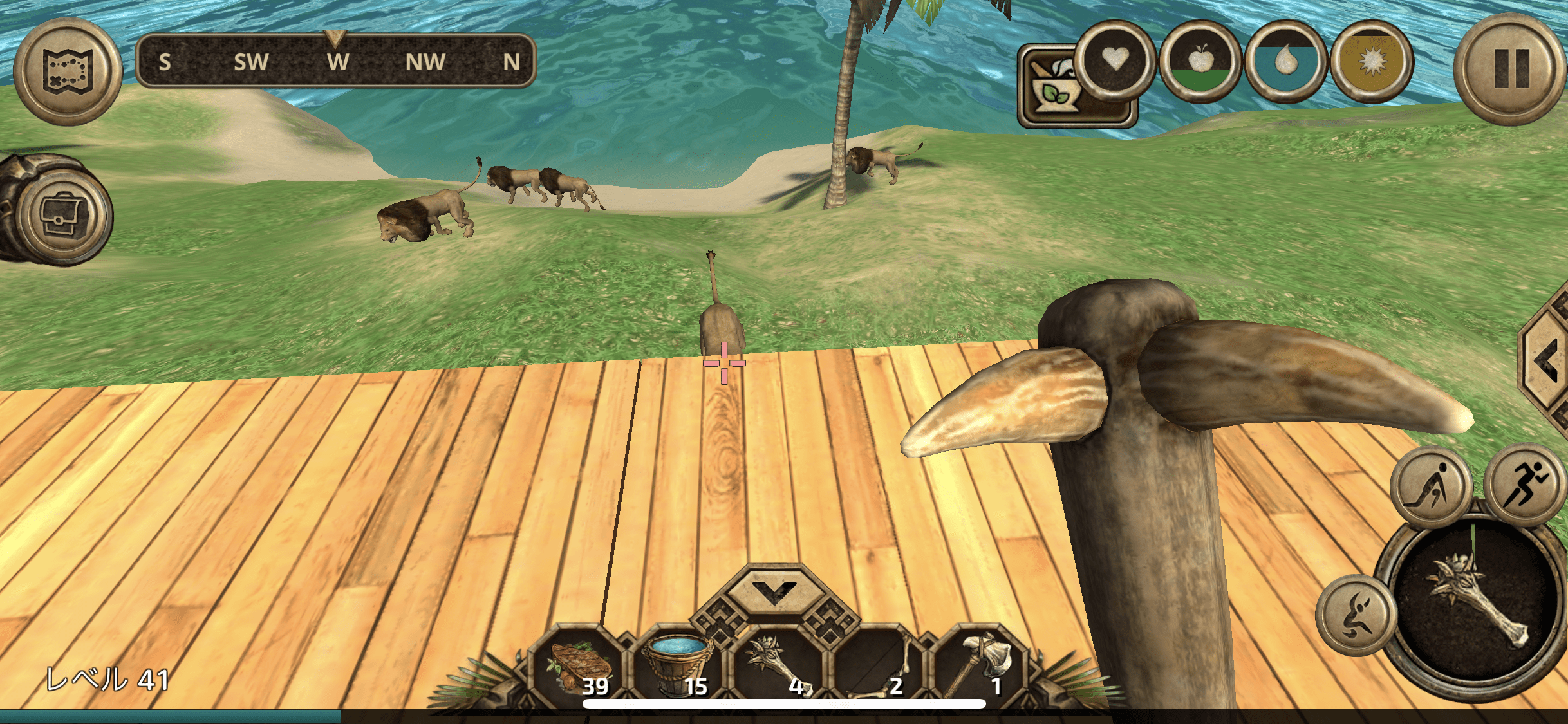 結構広さがあるので、とりあえずわーーーーーっと走り回ったら、ライオンの群れに追いかけられたので、海を泳いで回避しながら最初にライオンたちが固まってたあたりまでぐるりと移動し、即座に足場を組み立てた。