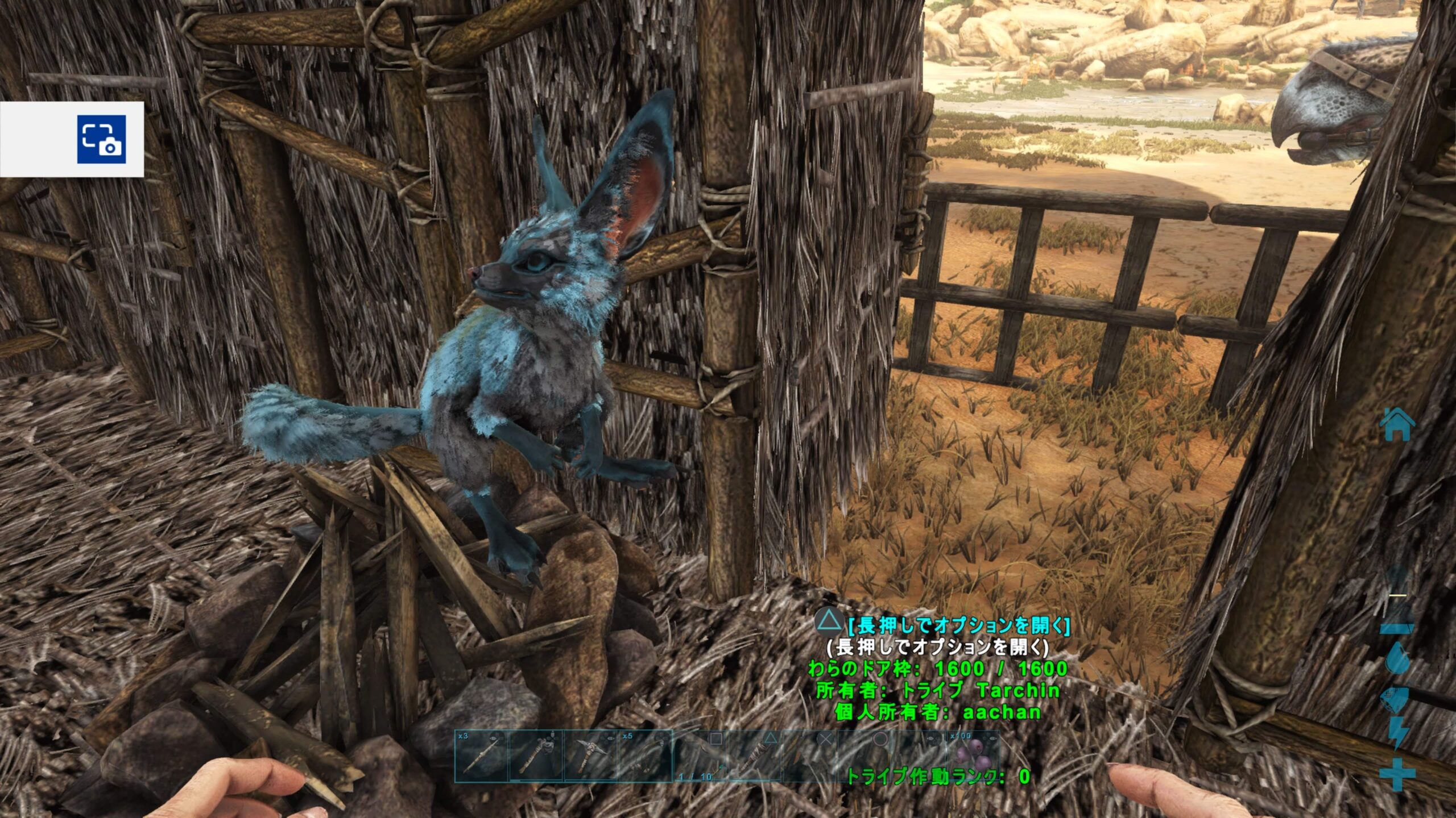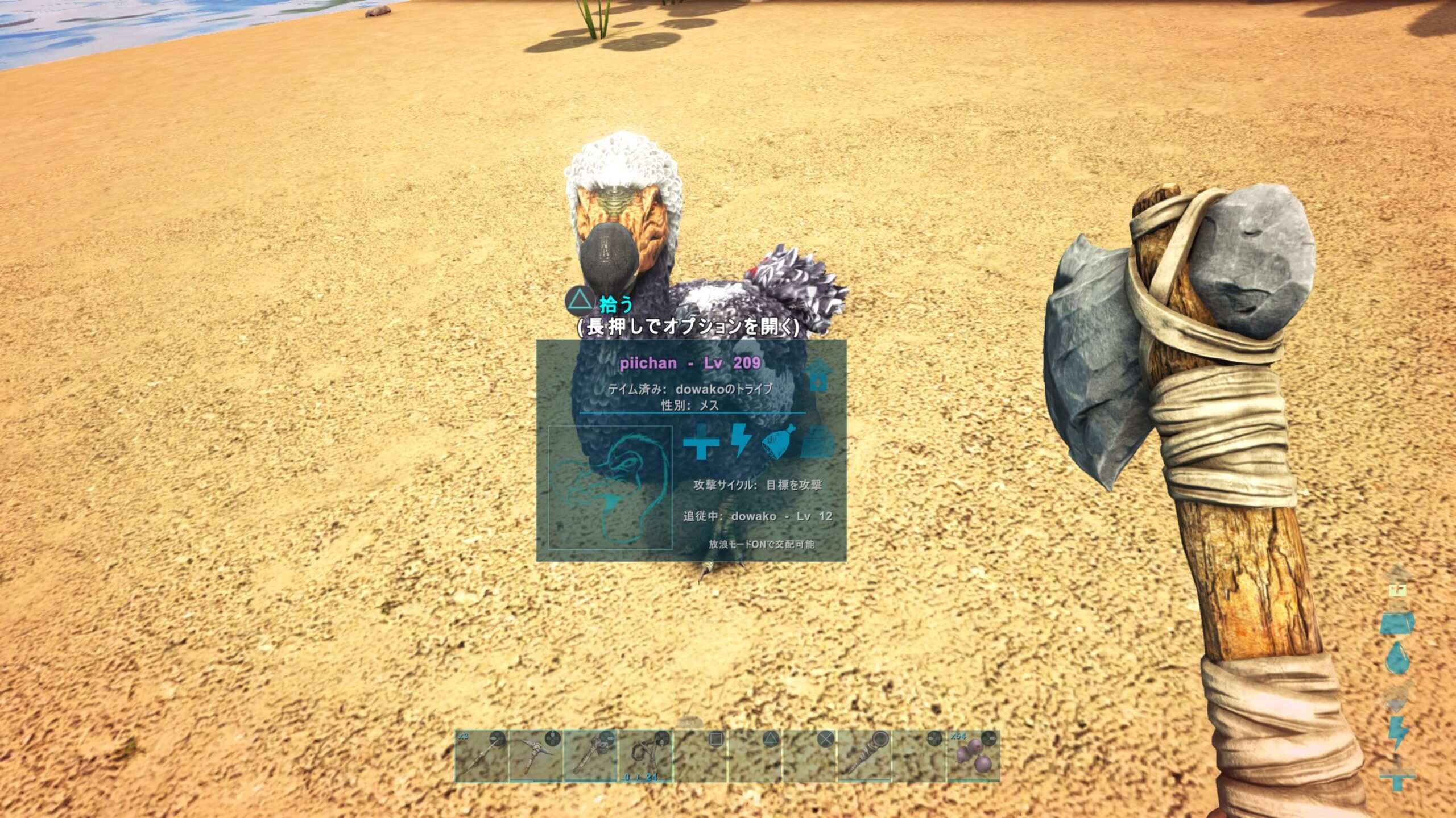 lv1しか見たことがないので麻酔矢一発でテイムできちゃう激弱だが(多分パチンコでもいける)、肩に乗せて移動できるのと、天候異常を予知して鳴き声で知らせてくれるので、熱波で死ねるスコーチドアースでは避難タイミングをはかる重要な役割を果たす。