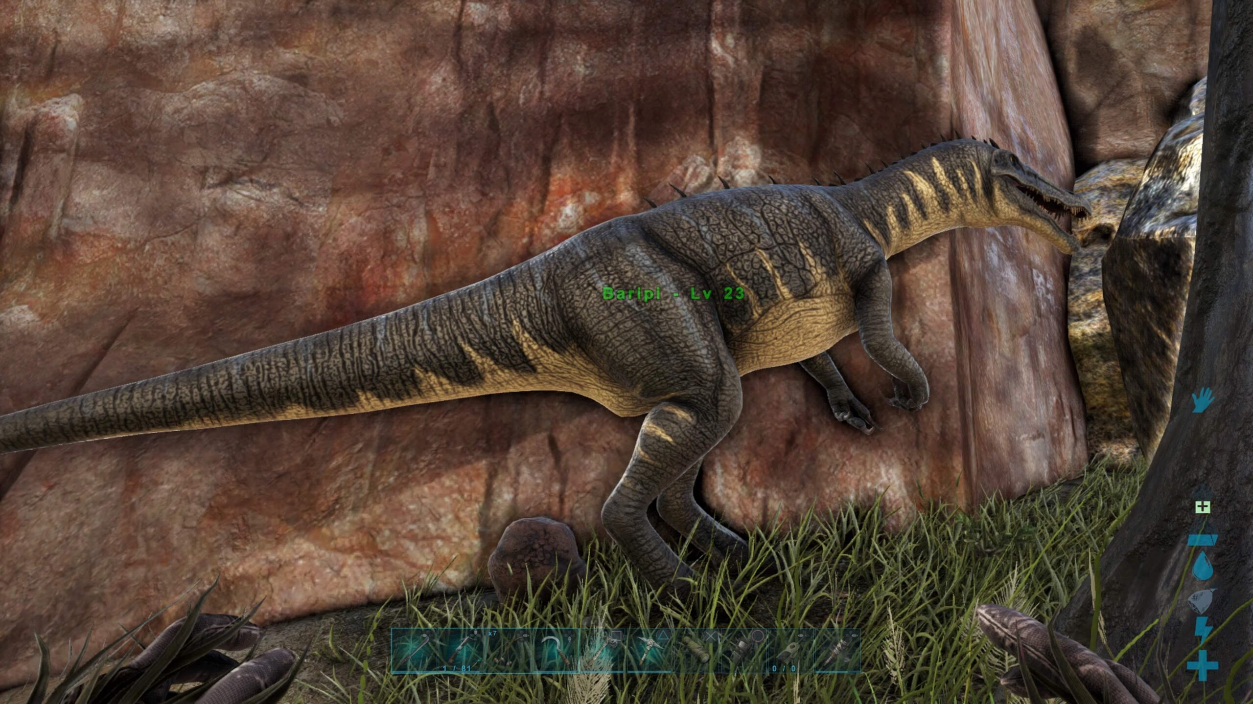 先に小型のバリオニクステイムに成功したが、こいつのスタンも強烈なのでボーラでからめたら出来るだけ距離をとって麻酔矢うちこまないとこっちがやられる。