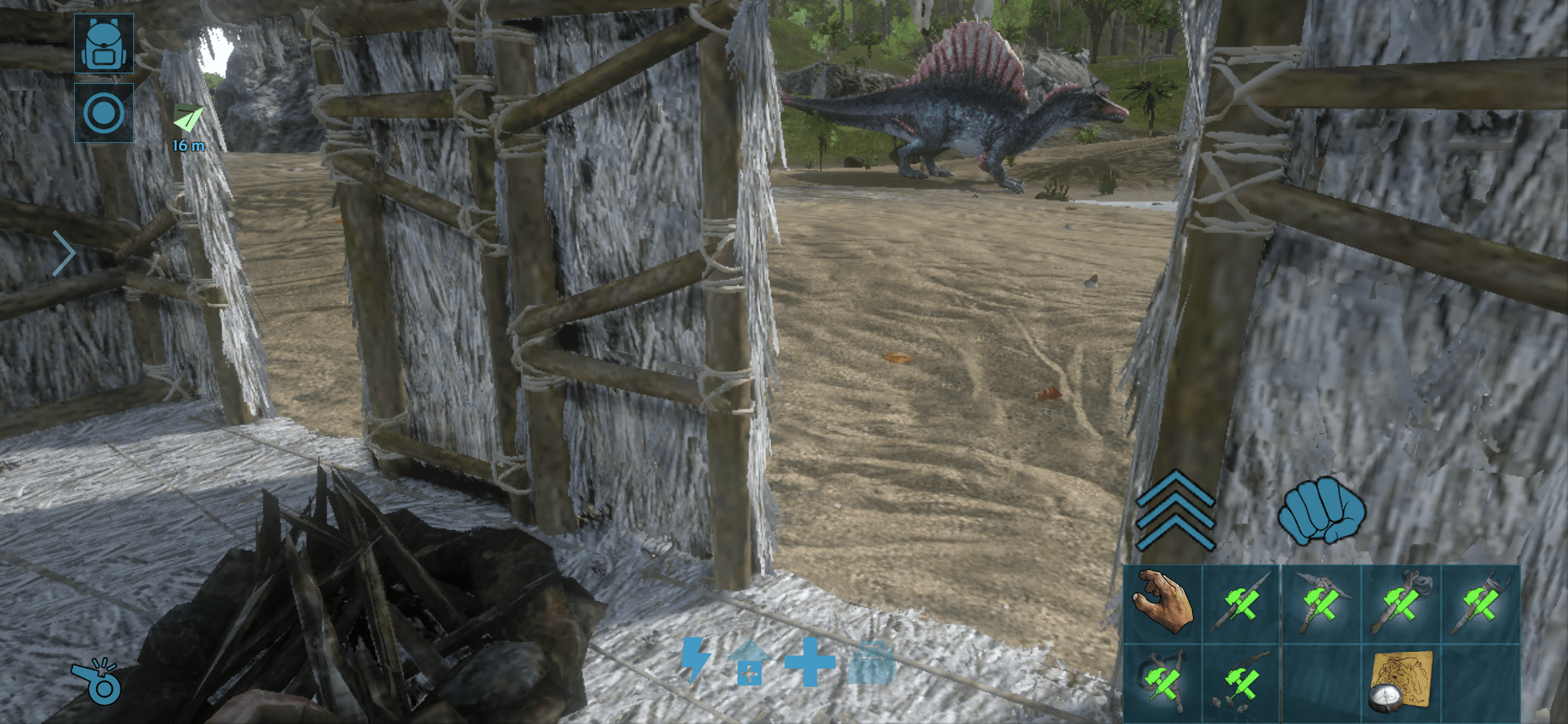 拠点目前から右にも複数スピノがうろつきだし、ちょいと左にはテリジノ、その先にはカルノとなんだかすごい危険地帯になってきたぞw