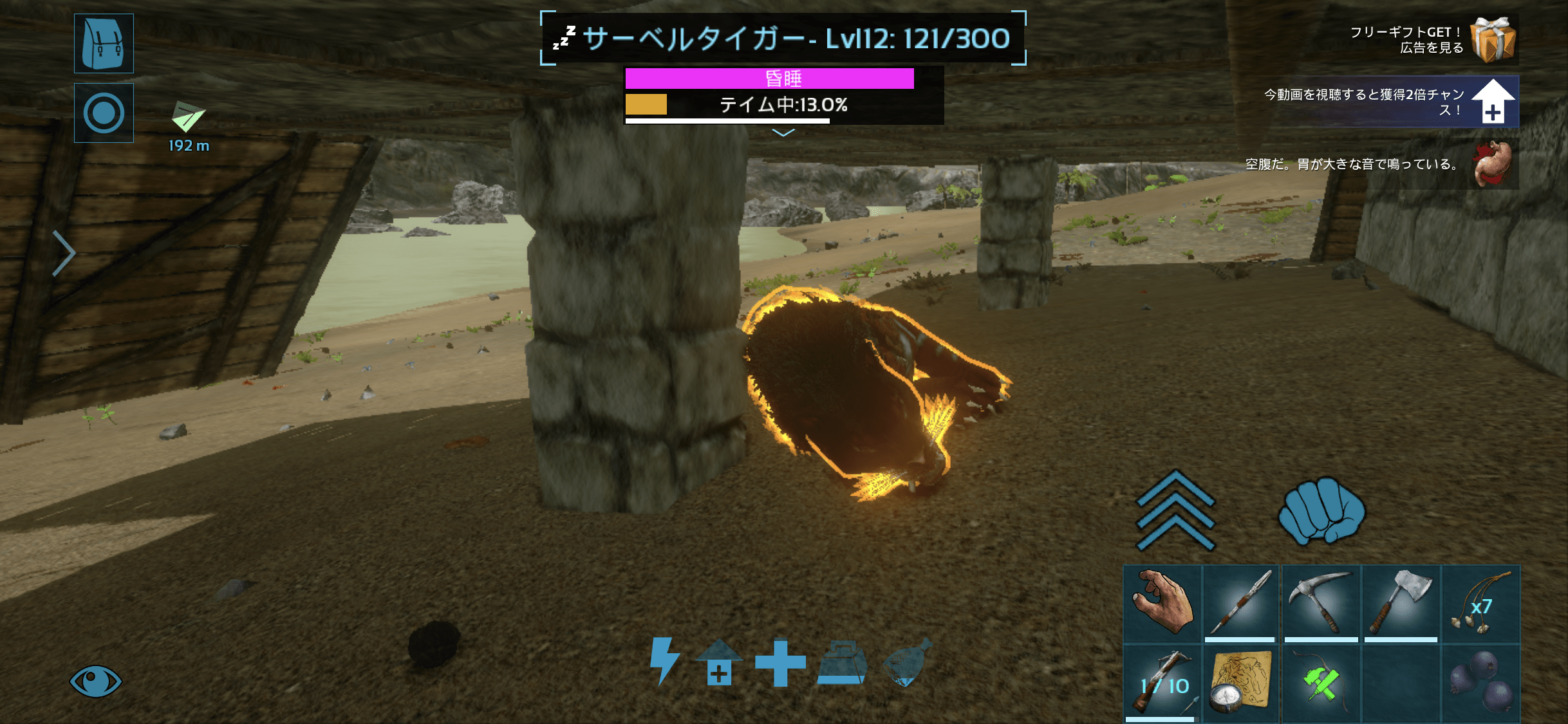 と思って明るくなってから回収しに行ったらサーベルタイガーに追っかけられたので、取り敢えず石造りの家に駆け込んだら、なんか床下にハマった。