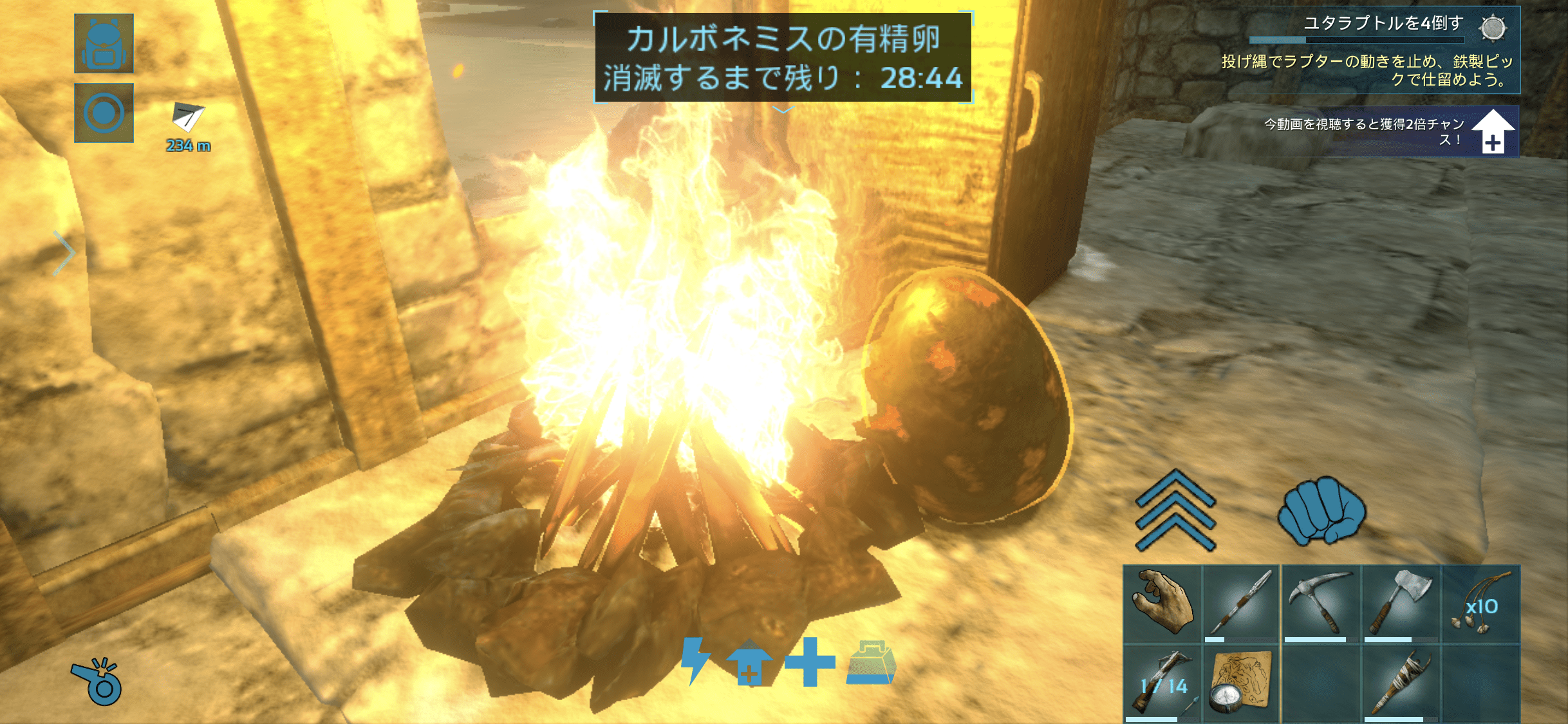途中でまたカメ有精卵を拾ったので温めてみるが全然孵化ゲージがでない。もうちょい焚火やかがり火で囲めば出るかな?