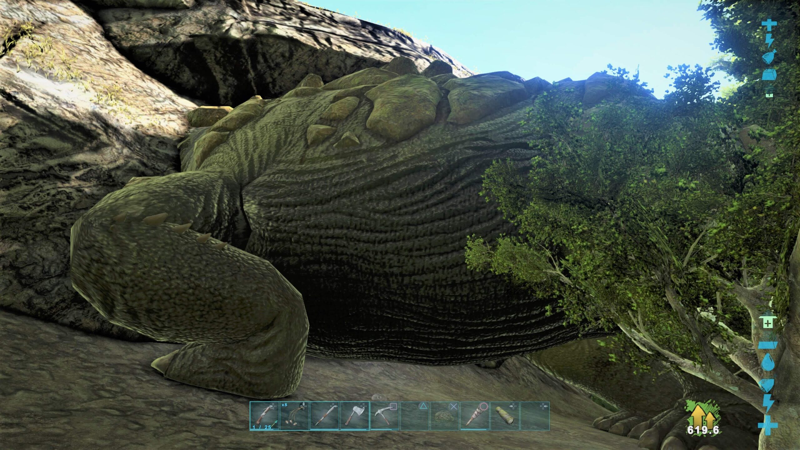 沼でバリオニクスを探したが、全然いなかったのでぐるりと一周してきたら、岩にはまってる超巨大な物体が!