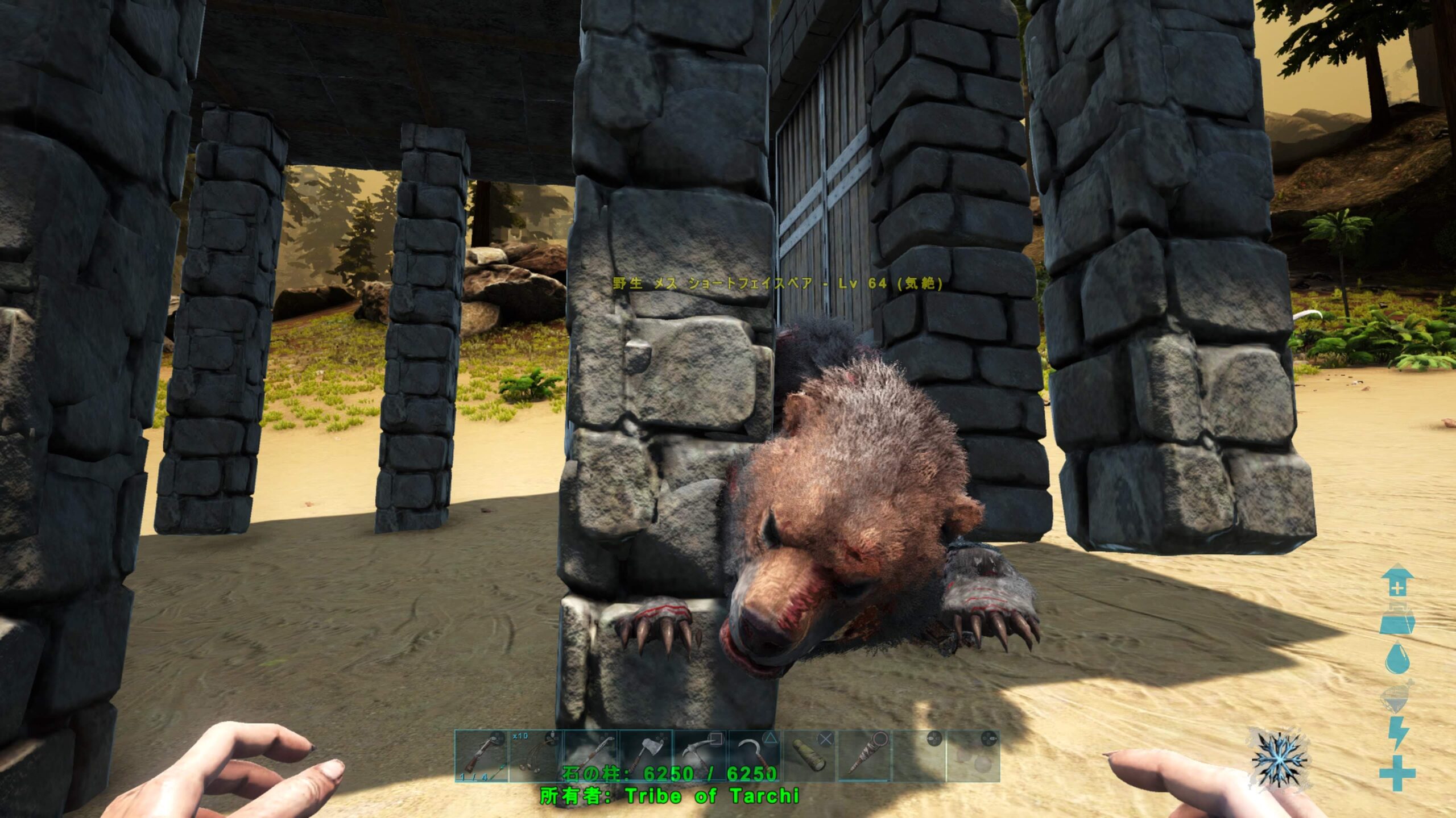 ただし、クマはなかなか狙い通りにまっすぐ入ってくれないことも多く、微妙に門のすぐわきあたりに引っ掛かって背後に回ってもなかなか反転してくれず、直近で殴られて初めて振り返るのが痛い(--;)