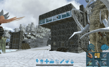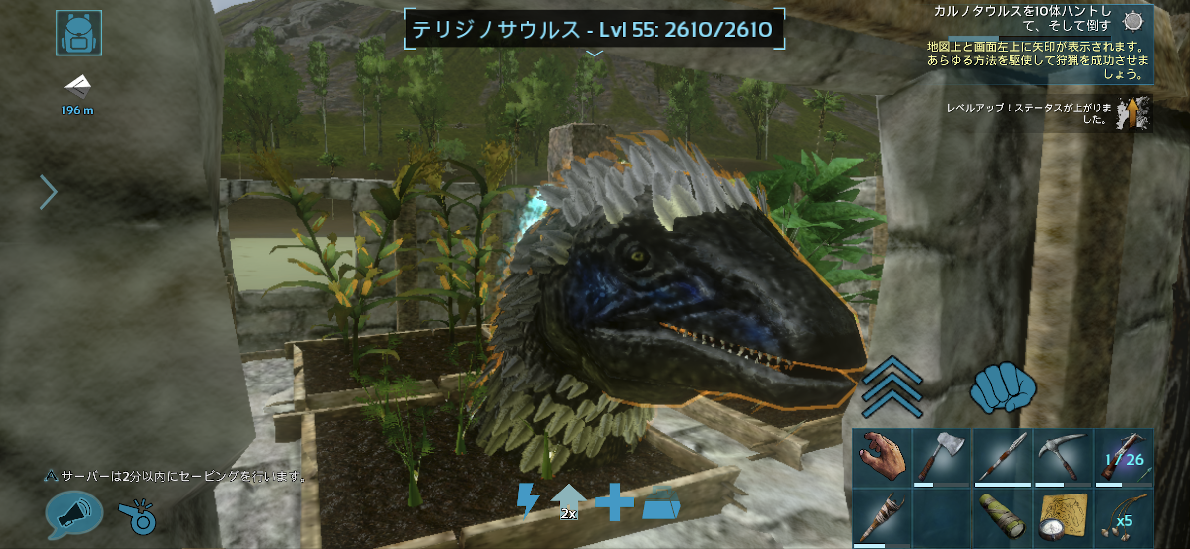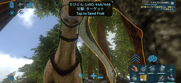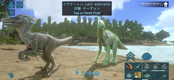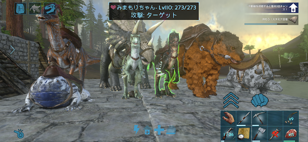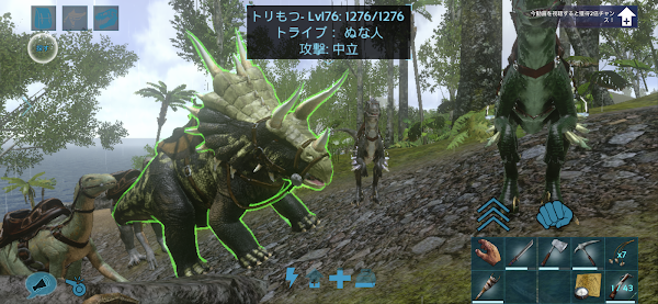 とりあえず家周囲の浜辺付近だけで建築物採集をしながらレベル上げ。全部手作業だとめんどいなあというところにドエちゃんを発見し石係を確保。時々山からサーベルタイガーやら、ケレンケレンやらが突っ込んでくるが、私が特に手出ししなくとも問題ないくらい...