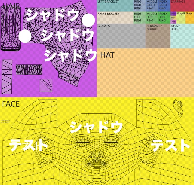 髪のメッシュ部分と、ベースキャラの上にオーバーレイ形式で直描きする部分に白抜き文字をいれてわかりやすく。