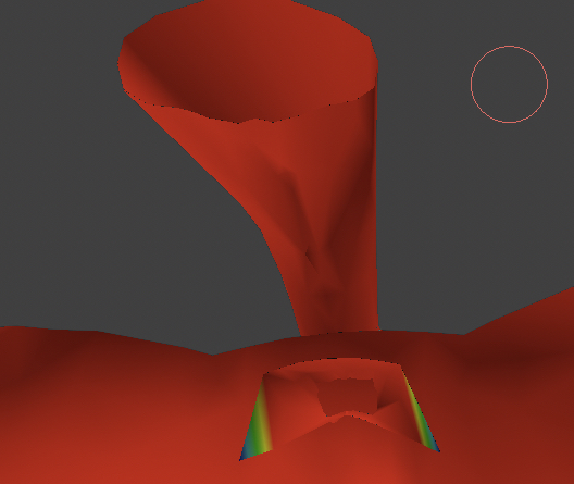 人体モデルや余計なパーツを非表示にして、裏側からも拡大しながら隅々までみていったらあったよ、ウェイトの塗り残しっぽい尖った角が。しかも外側先端がもろ青やん。