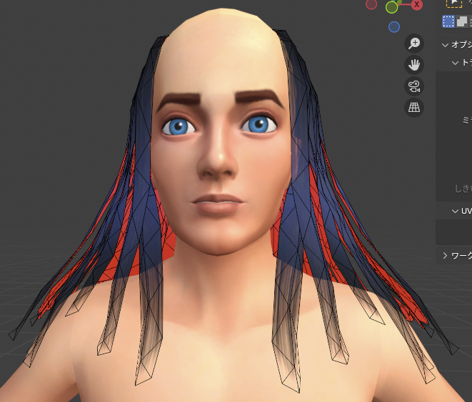 自分の髪をかぶせてそれぞれの点の位置を網羅して、ウェイトを塗りつぶして。。。とやってるとどんどんぐちゃぐちゃになっていくw。正規化の影響で頂点グループ切り替えると勝手に変わっていくからやっかいなんだ。