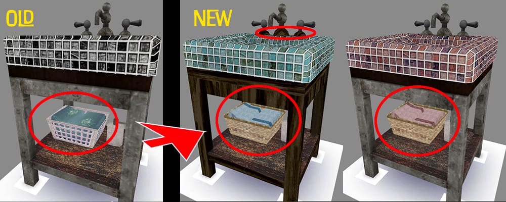 で、主にノーマルマップとスペキュラを調整し、ついでに一部テクスチャも見直したり追加したり、正しく分離したり(ノーマルつきで柱が左右となしが混在してたのもアウトだった)