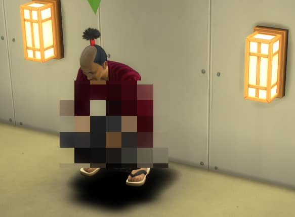 トイレのアニメーションで背後の紐を本来引っ張る動作が入るので、神様に感謝をささげているという雰囲気で。
