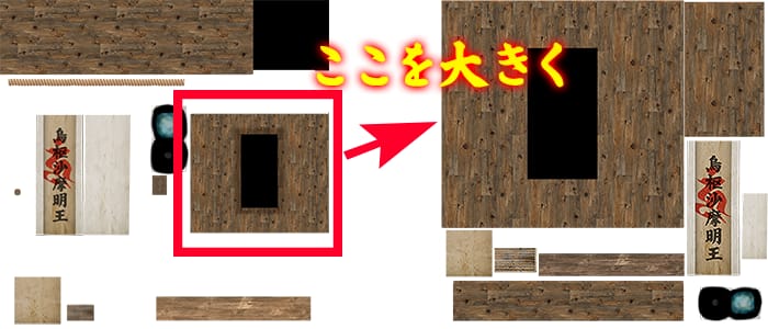 元が512pxだったのを1024pxに変え(床は512px)、それでも床と違って全面一つのアイテムでUVを埋められるわけではないので、できるだけ主要な部分を大きくとって、暗くなってもよい細かい部分は小さくとUV自体も全部作り直した。