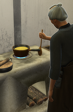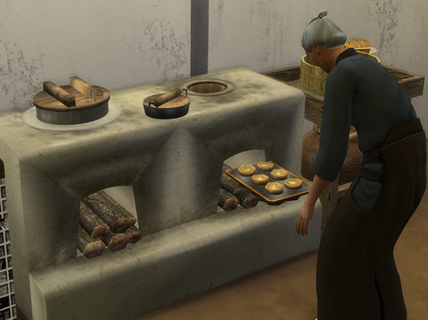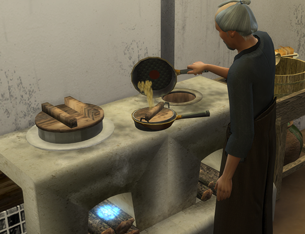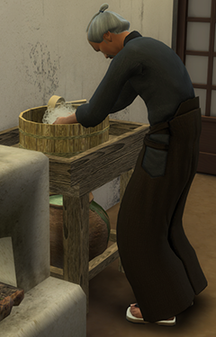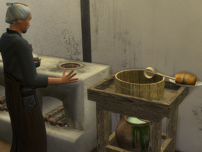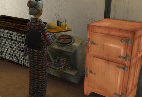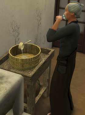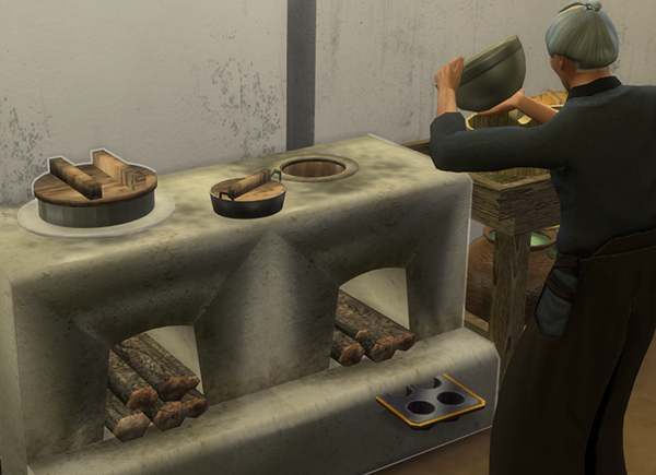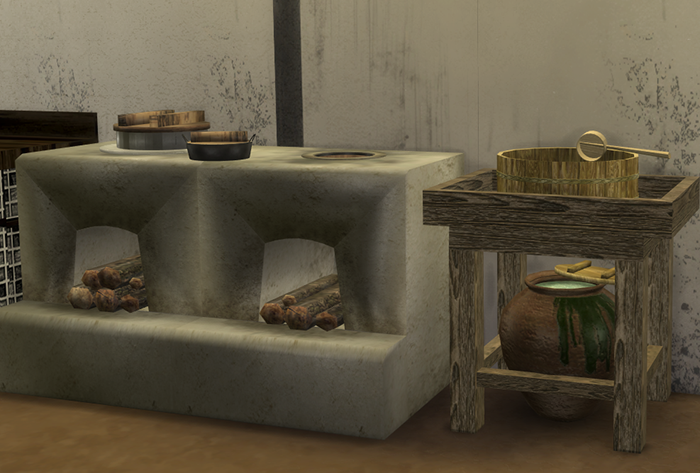 庶民はまだ一般的に座の時代だから、土間にタライを置いて洗い物してたらしいが、シム的にはそうするとシンク使うアニメーションなども変更の必要がでてきてややこしくなるので、台に乗ってるとありがたい。