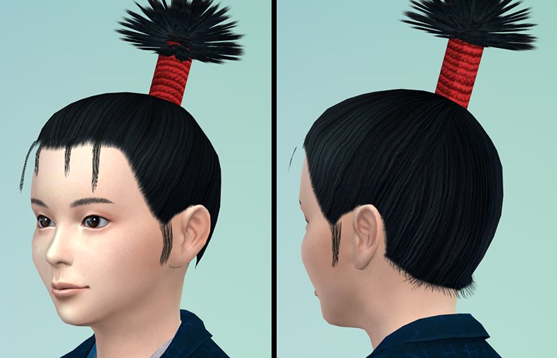 - 3~4歳の子供が結う、頭頂のみ筆の穂先のように髪を残して剃り上げる一般的な髪形。