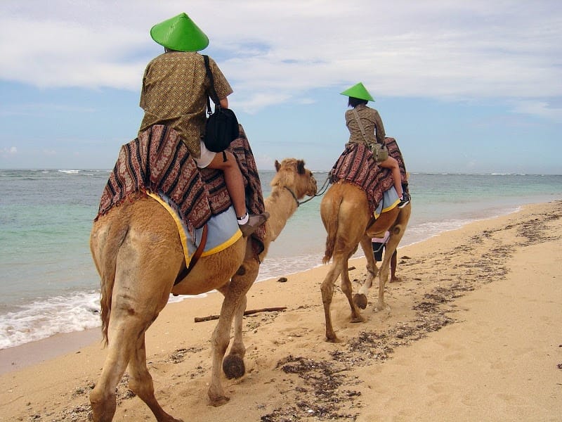 白い砂浜が砂漠気分である。とはいえ、もちろんラクダはバリ出身ではない。オーストラリアからきたそーな。