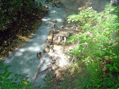上流は高熱のためやけどしますが、流れる間にだんだん冷めていくので、ほどよいところに川そのものを利用した足湯があります。