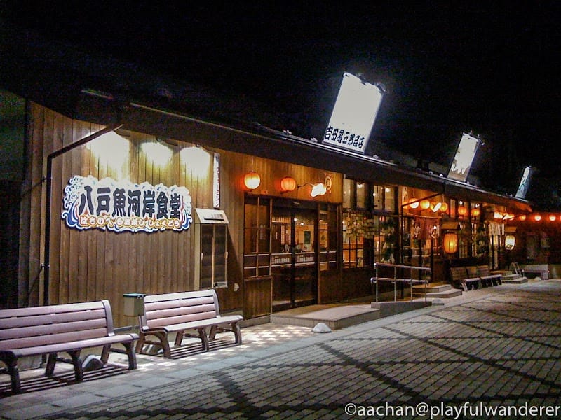 とりあえずさっぱりしたとこで夕食を。先日来る時にはイカメシを食べたのだが、駅をでたところに「八戸魚河岸食堂」という長い屋台村みたいなところがありました。