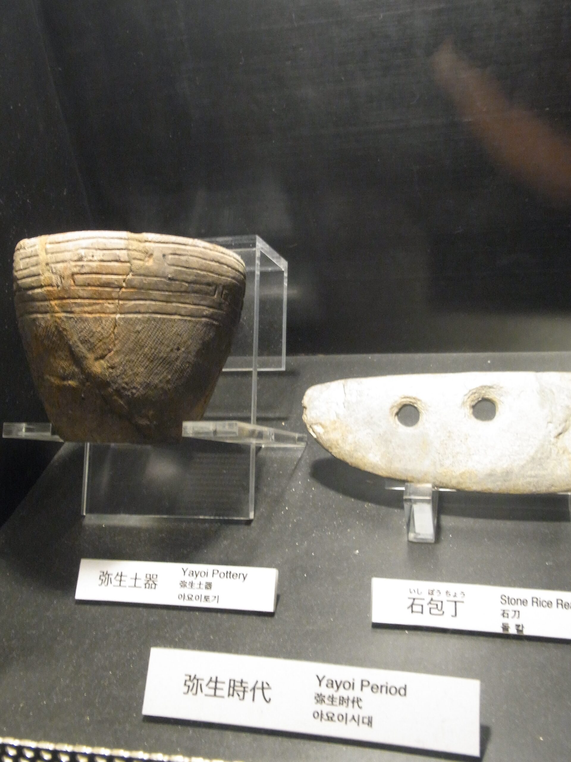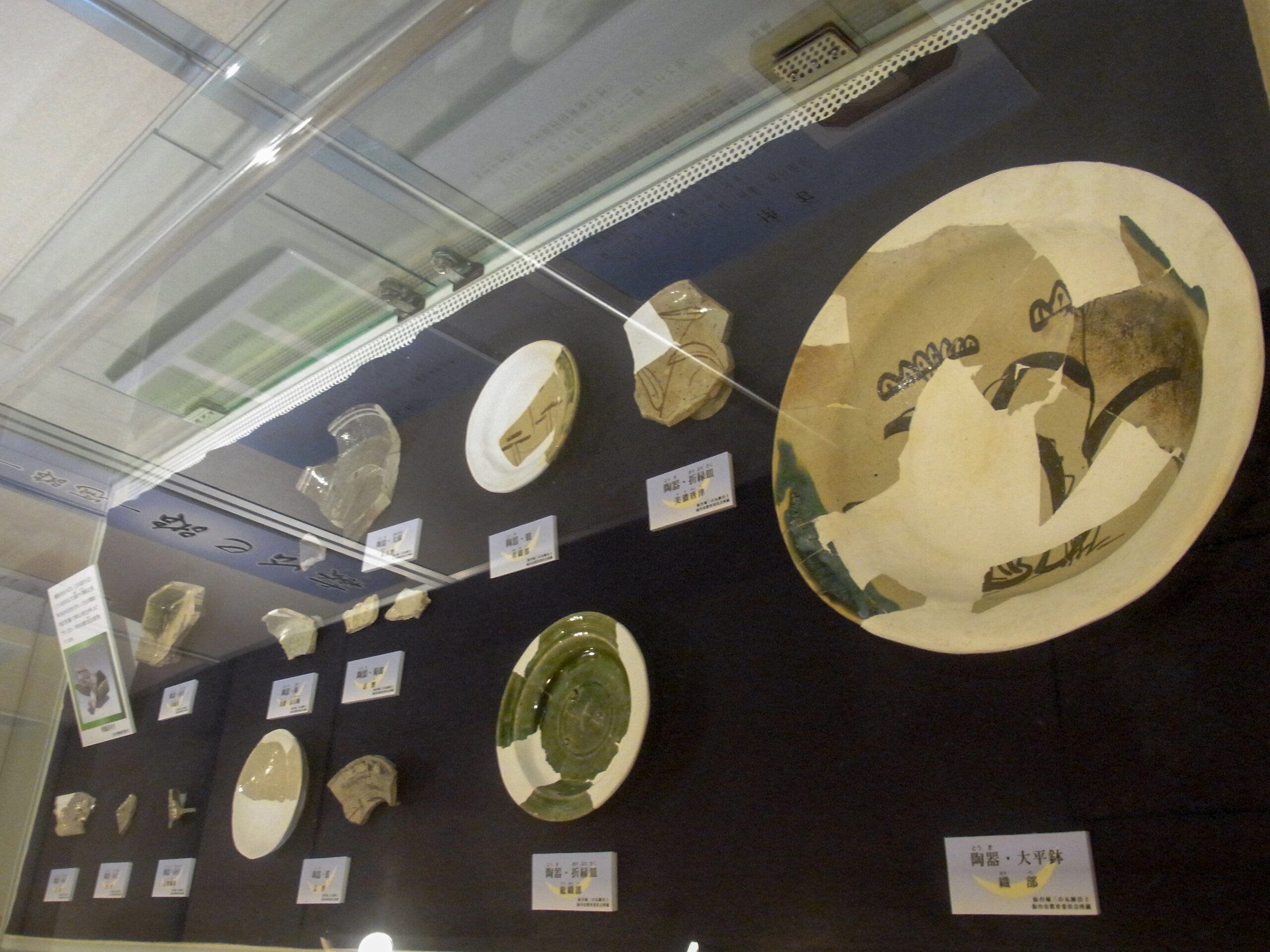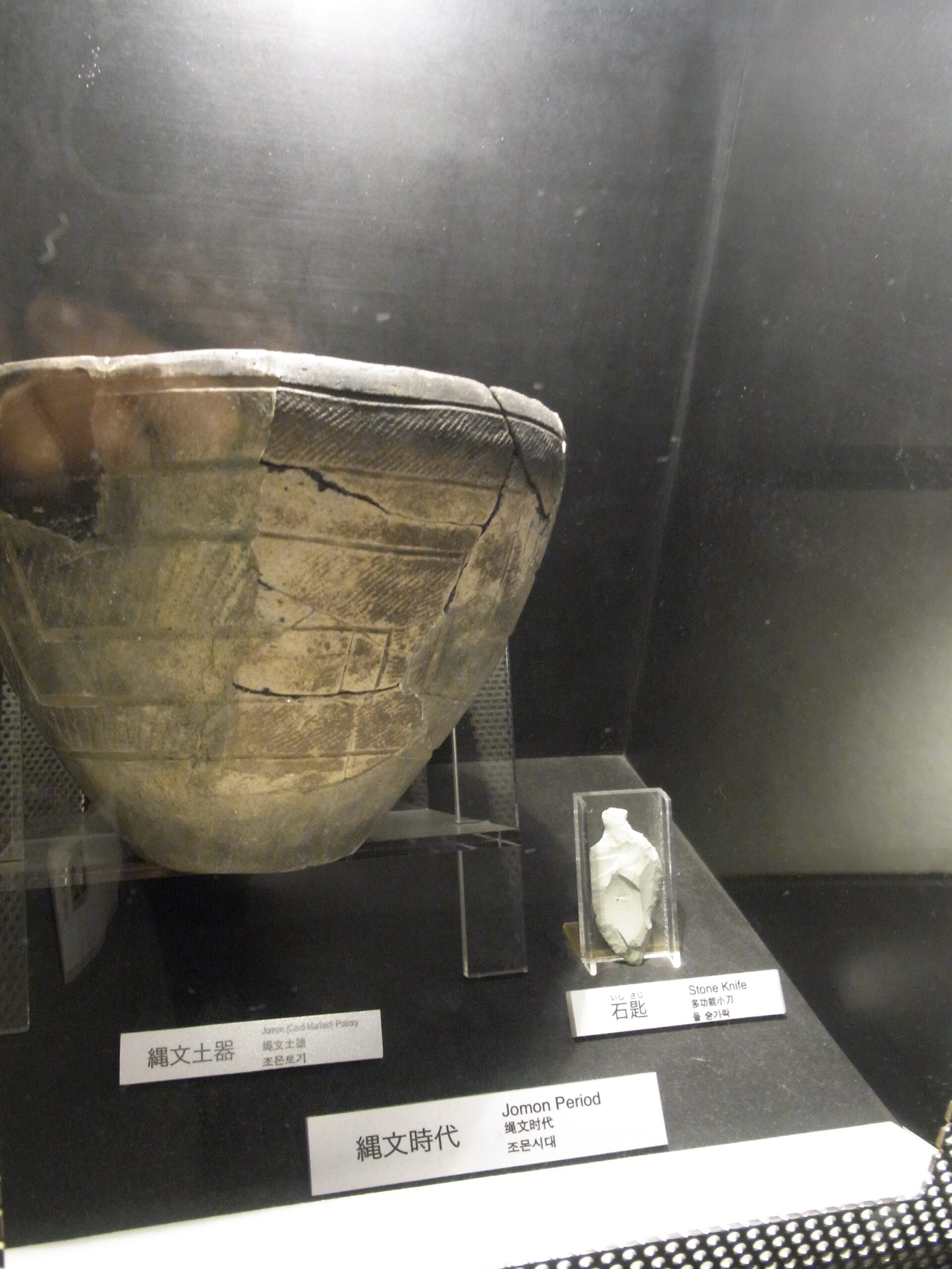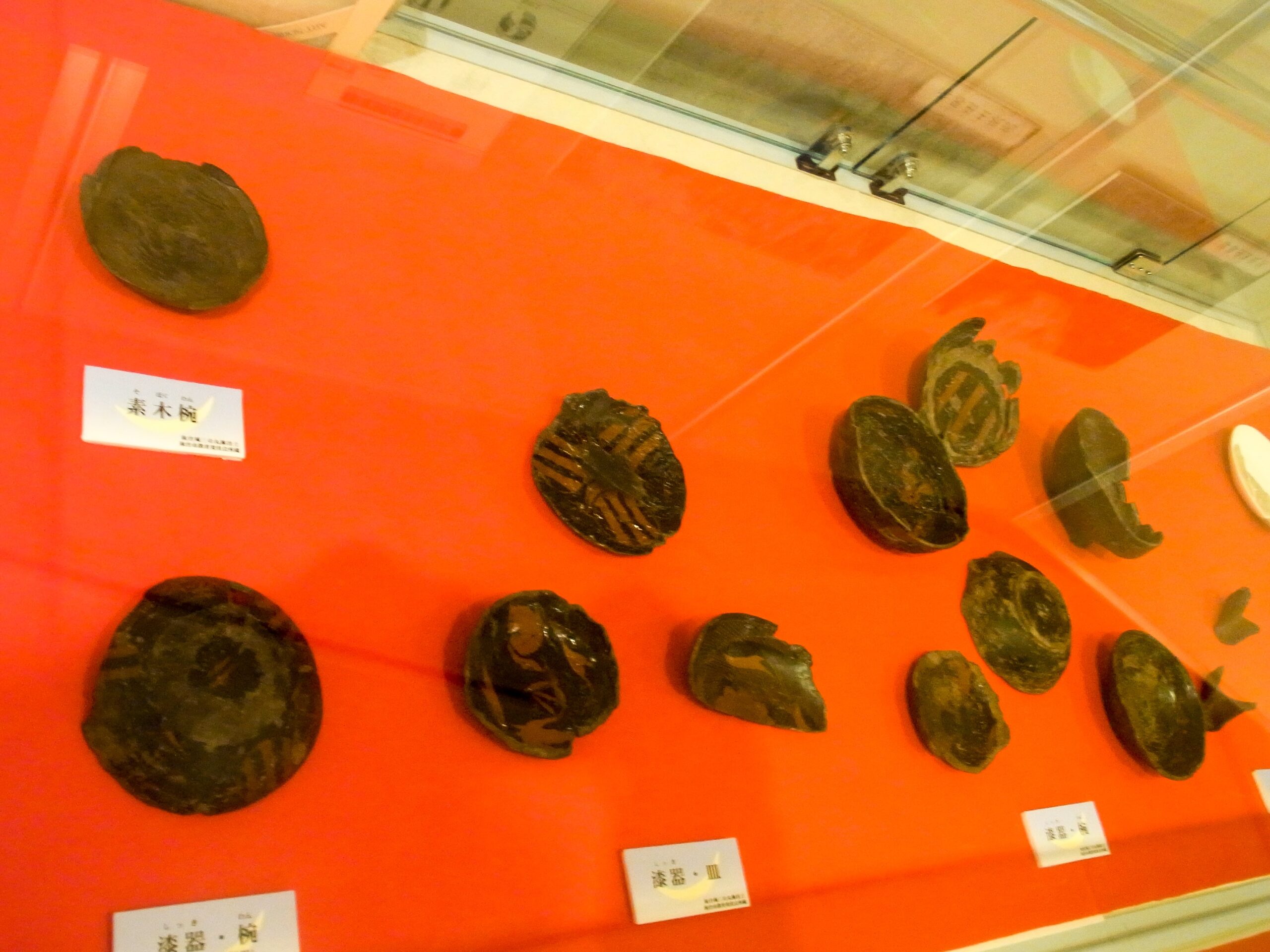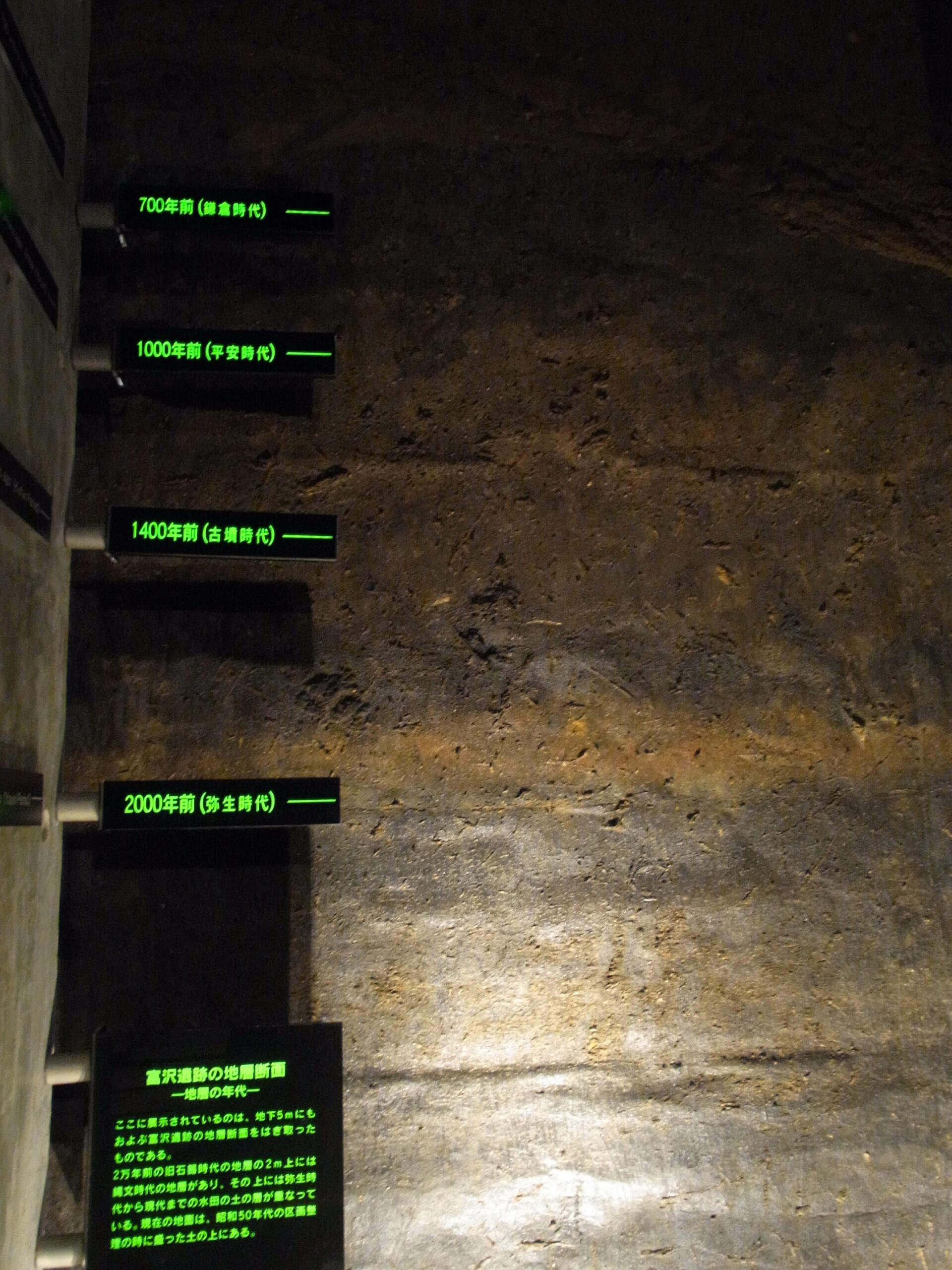 上階へと続くスロープの途中にも、縄文時代や弥生時代の土器等がさりげなく展示。これらもこのへんのもうちょい上の地層から出土したものかな?