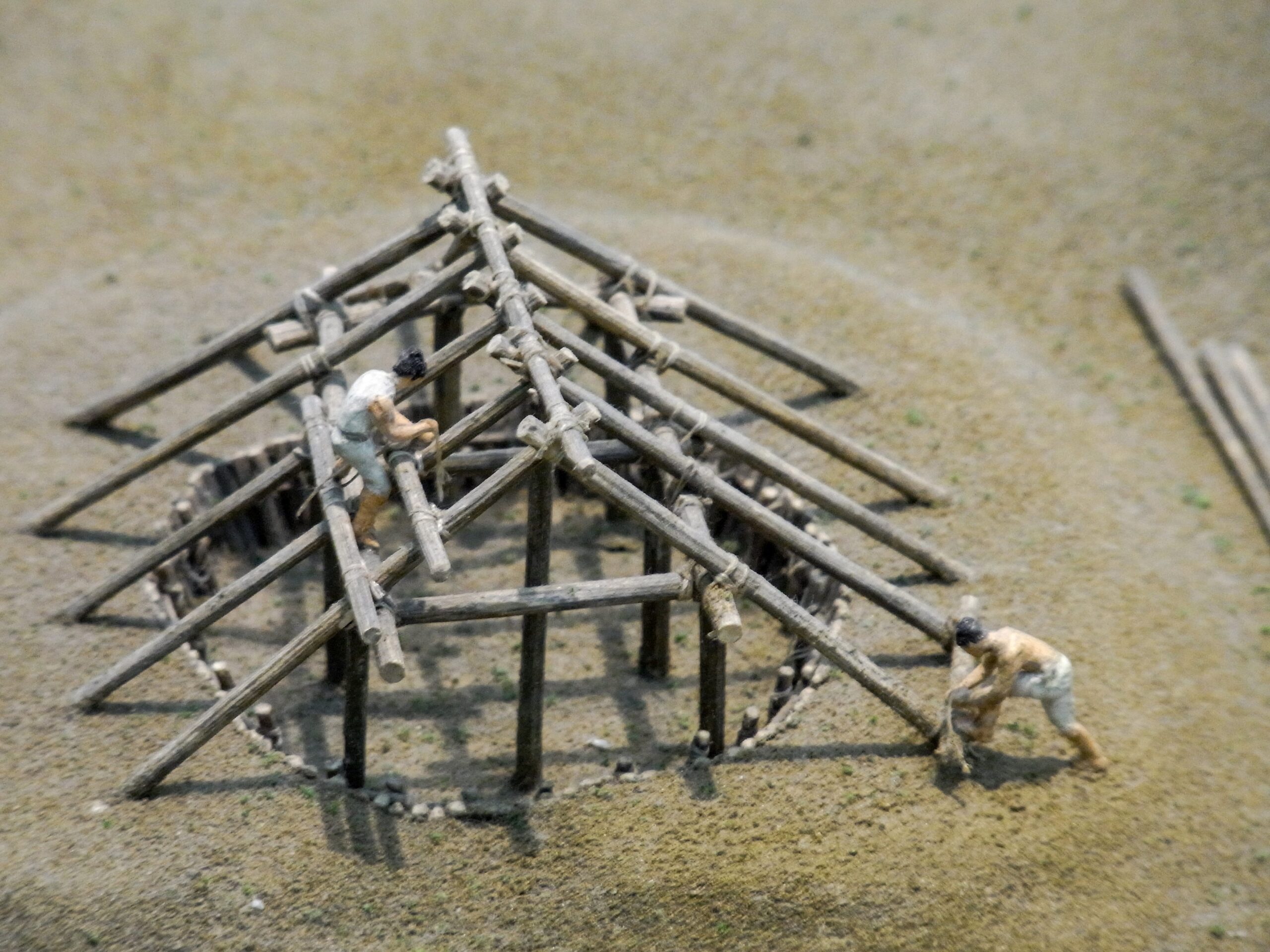 それを組み上げて、竪穴式住居を造る大工さんたち
