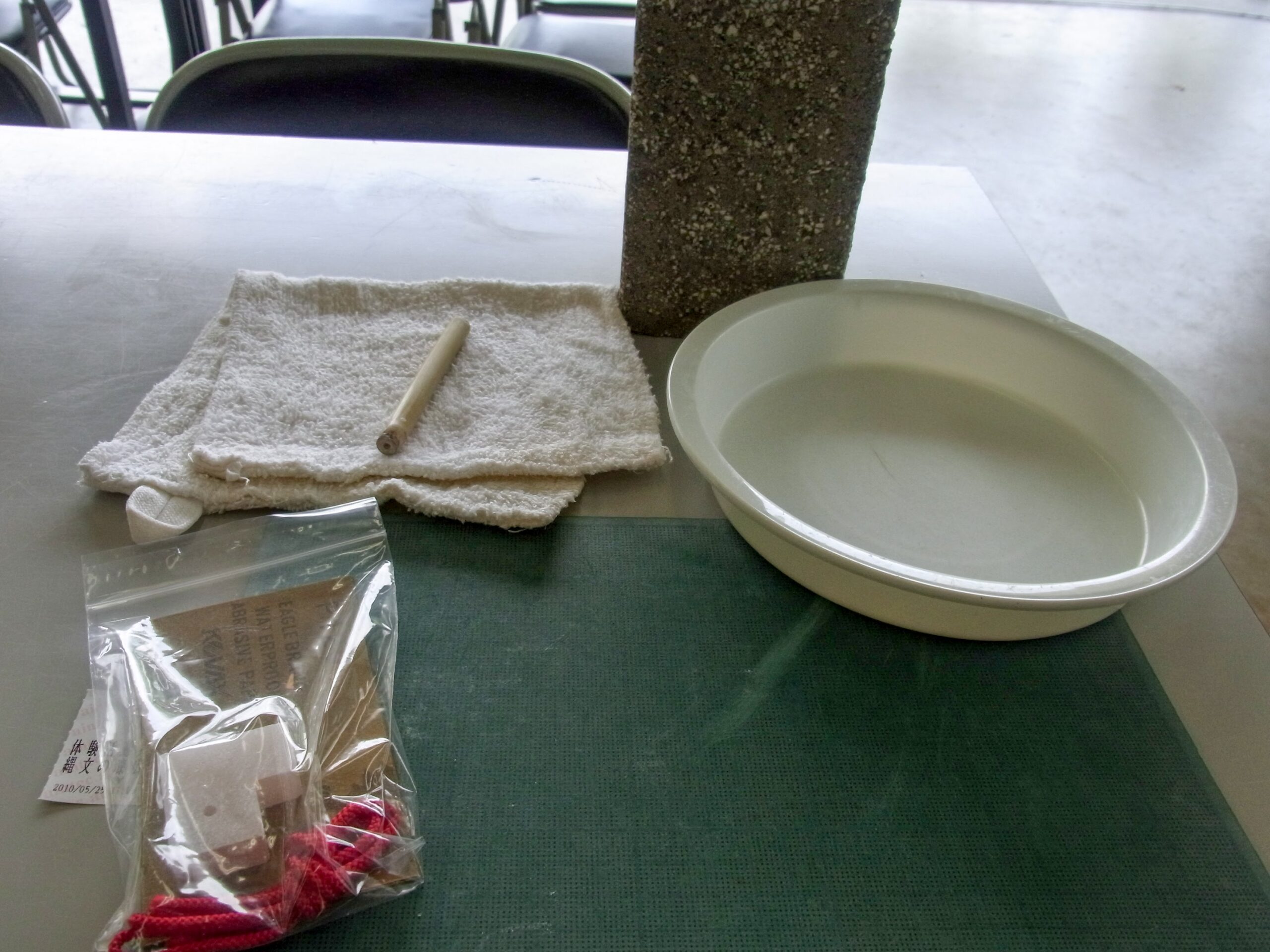 粘土板、荒い石のブロック、雑巾、竹の切れ端、水入れを準備する。