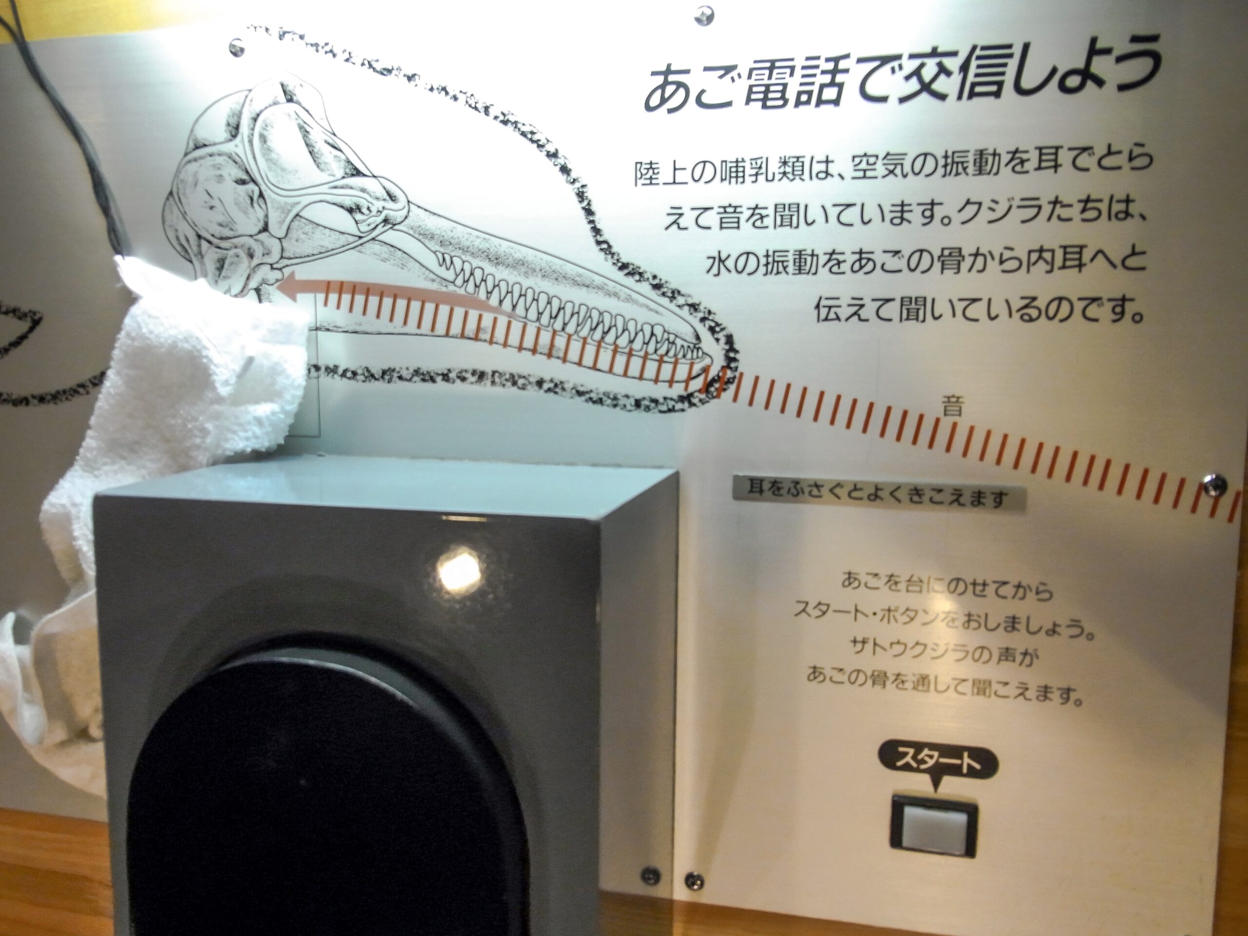 見るだけではなく、体感型の展示もいろいろあります。今やヘッドフォンにもでた骨電動式というやつだな。