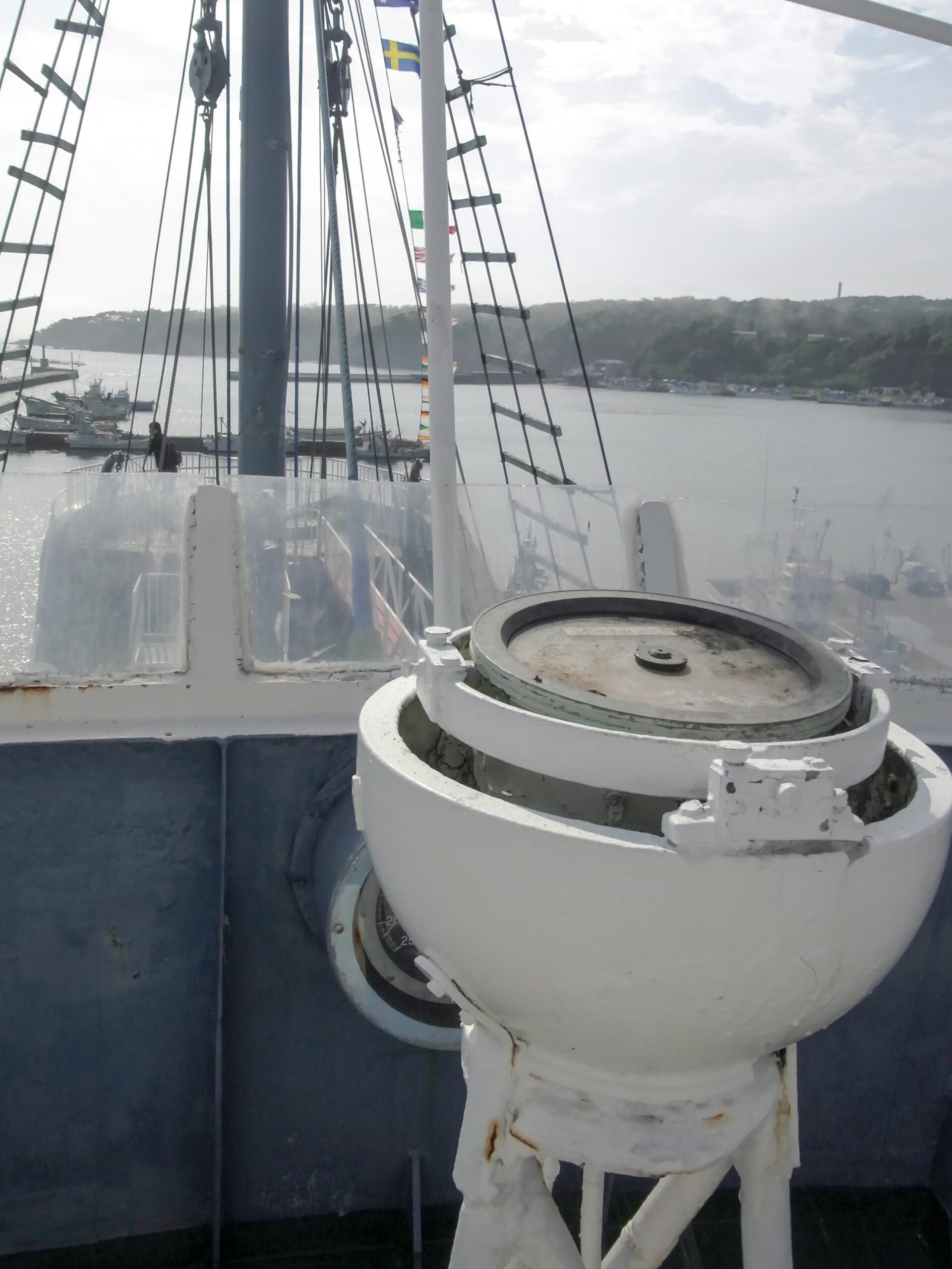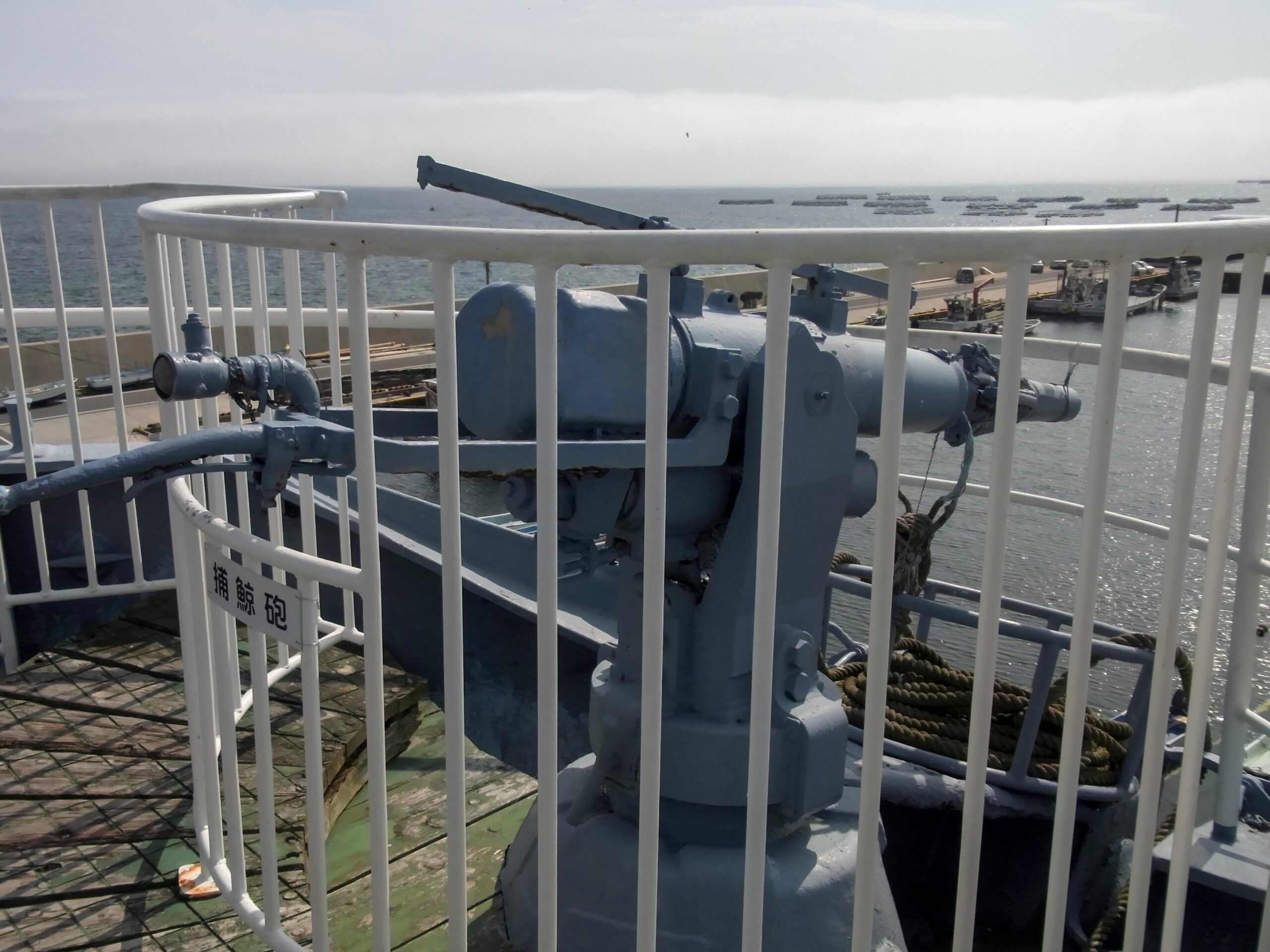船の先頭には捕鯨の時に打ち込む銛の発射台みたいのもあります。ものすごい勢いで弾丸とか飛び出しそうなごっつい構え。