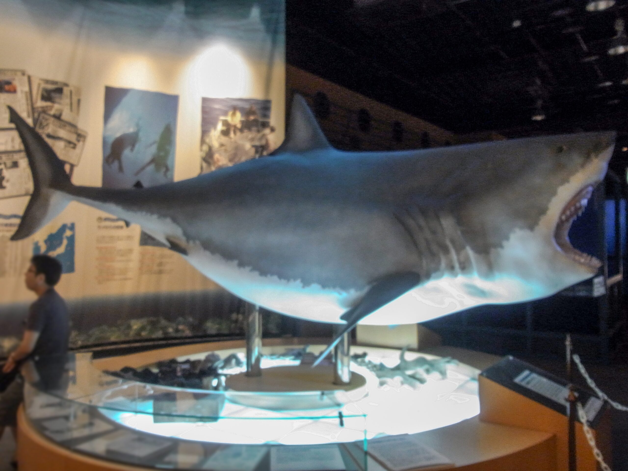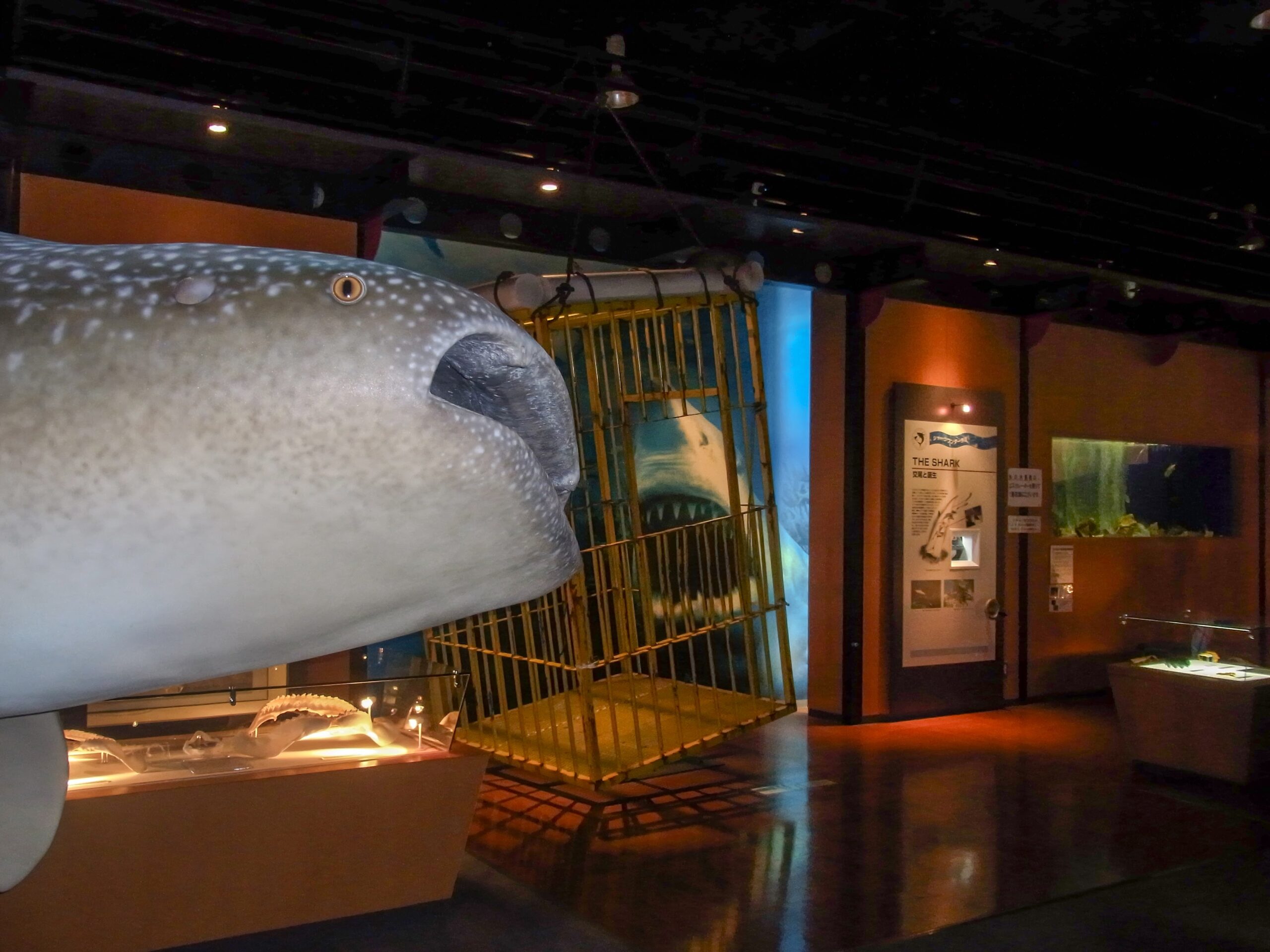入ってすぐ、でかいホオジロザメの模型が口を開けて出迎えます。歯は本物を埋め込んでいるらしい。