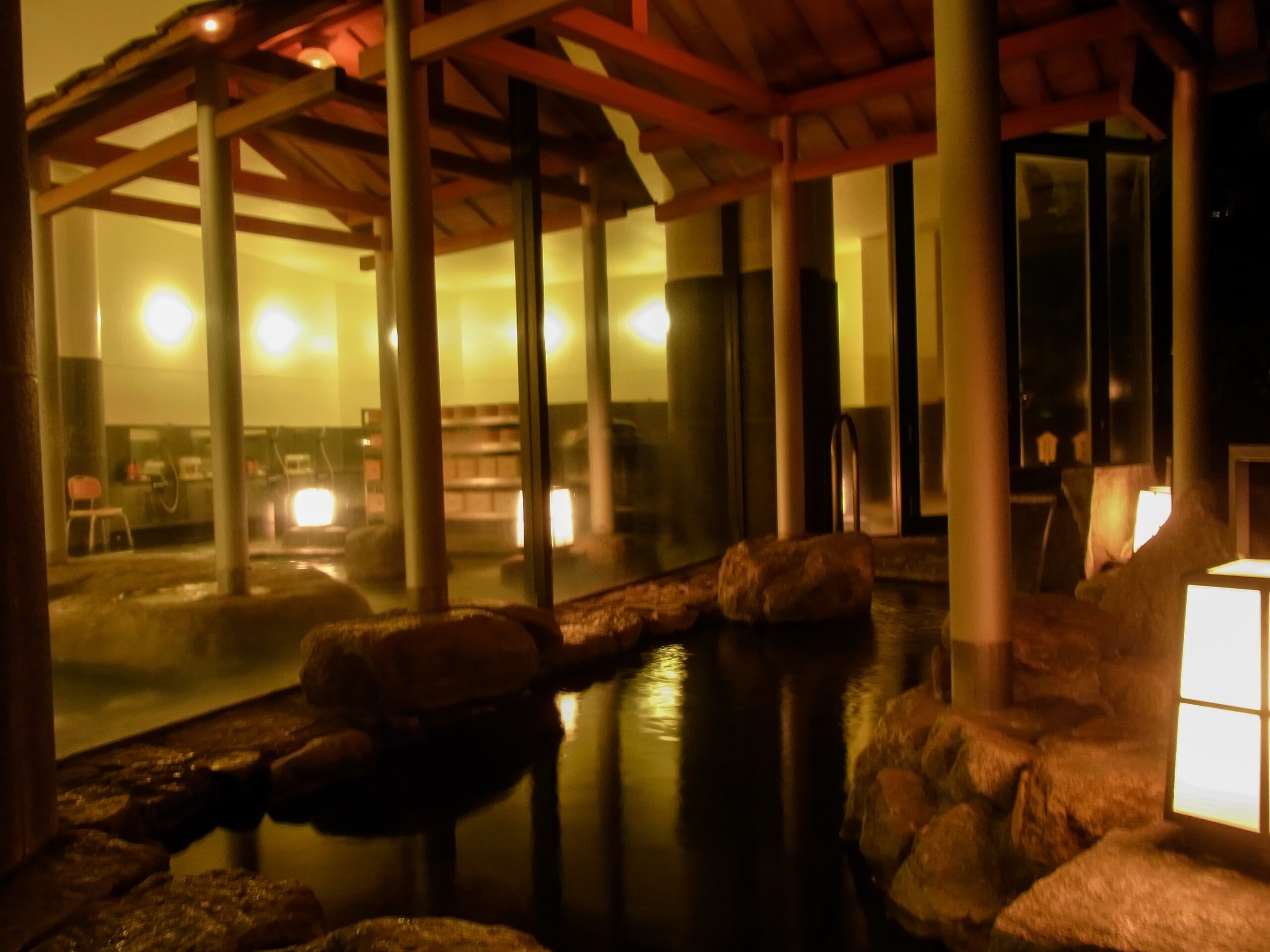 まずまずの広さがあり、内湯にはサウナ、うたせ湯、熱湯、ぬる湯、寝湯などがあります。泉質はアルカリ性単純温泉ということで無色透明。