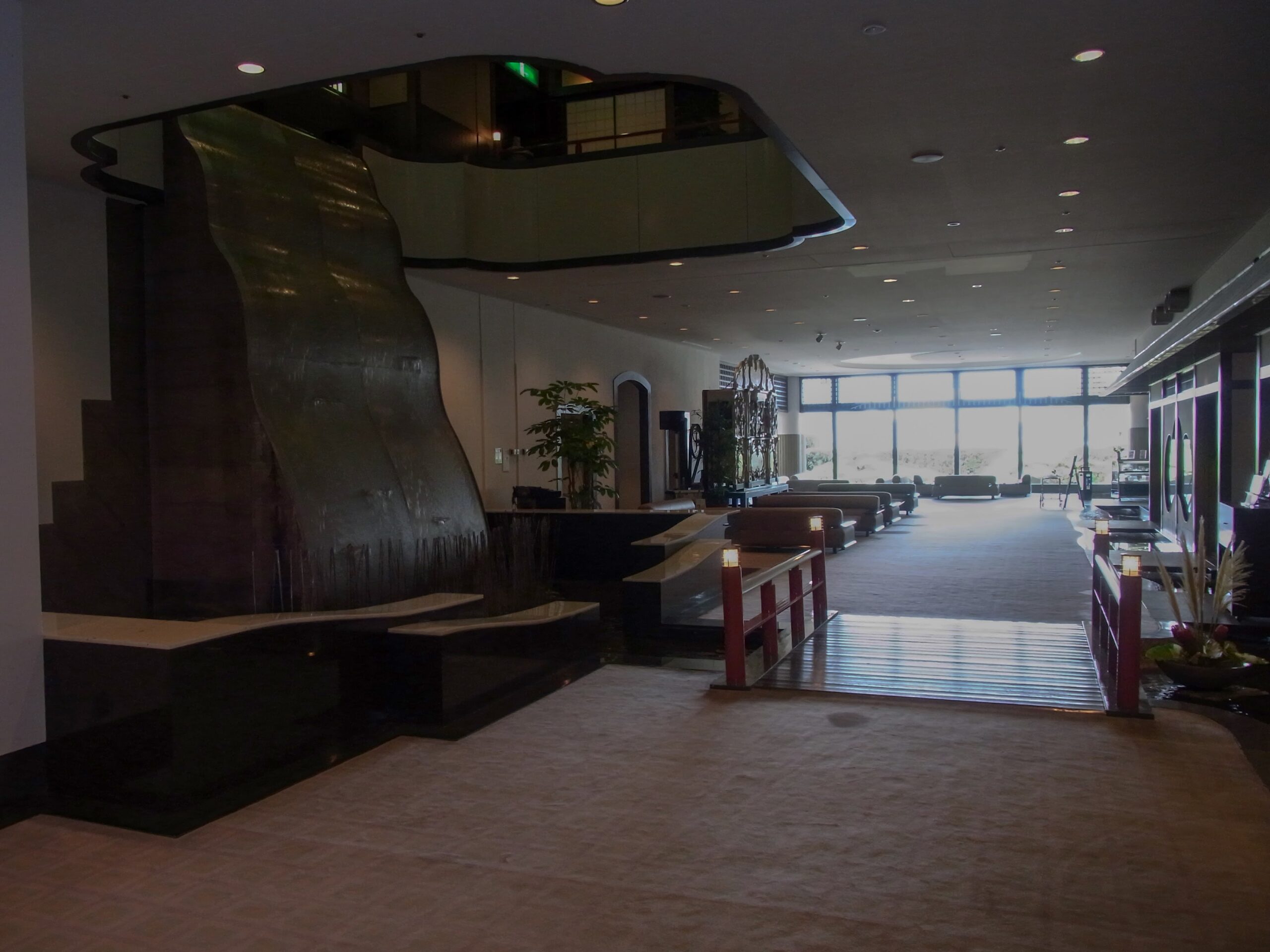 館内和風レストラン前は、ロビーから吹き抜けで曲線を描く滝がオブジェのよう。