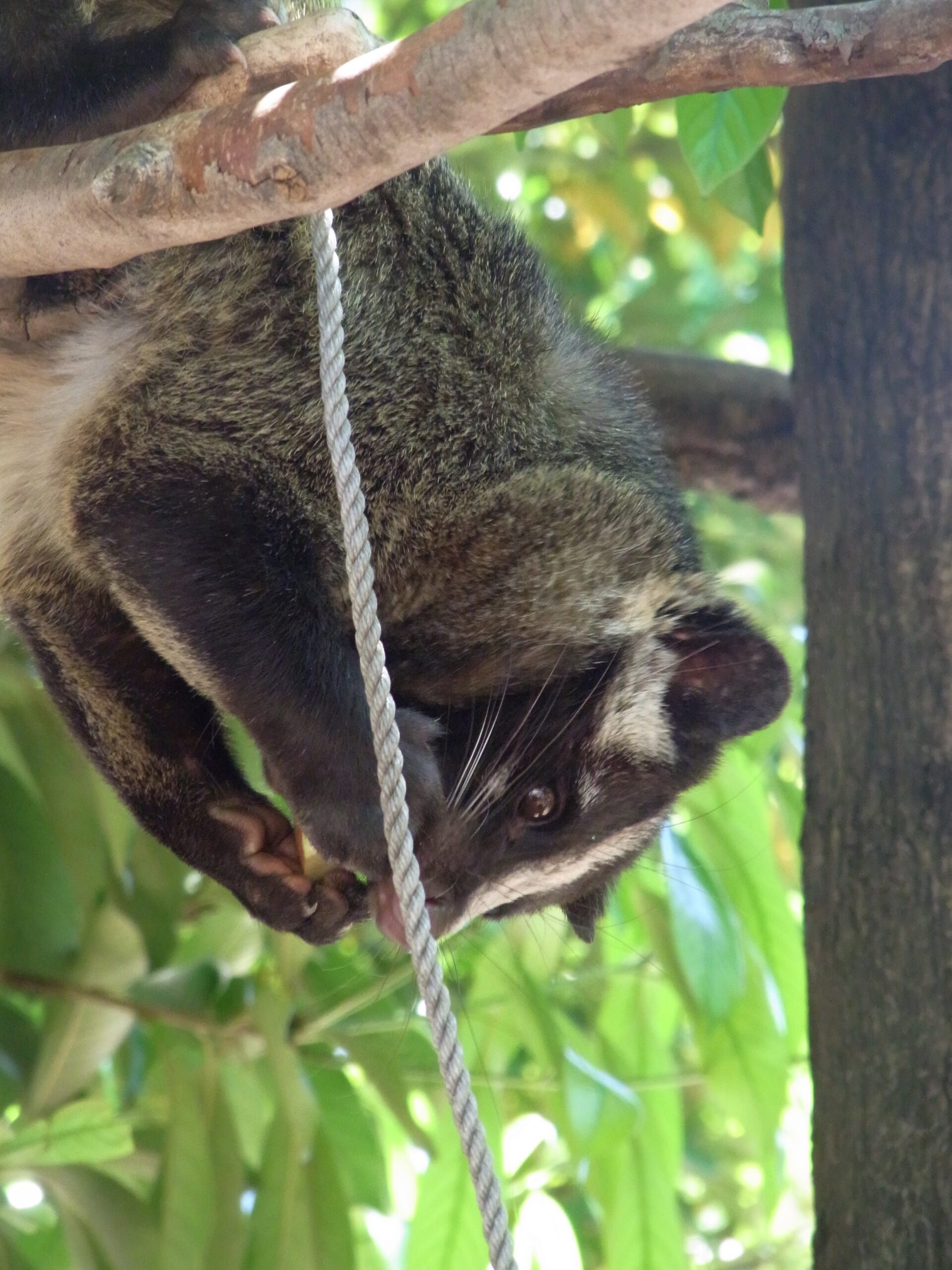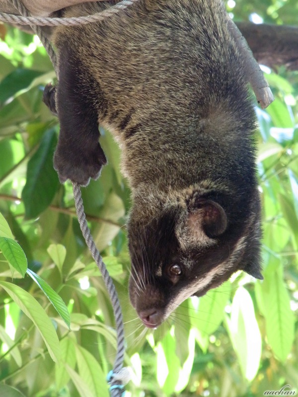 しかもちょうどご飯タイムがはじまったのだぁ。ロープやかぎ針にぶらさがった餌を、両手で器用にたぐりよせて食べる。かわいいだけじゃなく頭もいいのだな! なんか悔しいぞ。