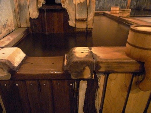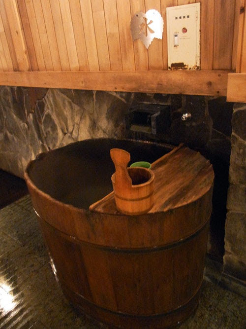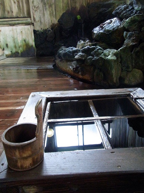 この井戸のような形の湯貯めが結構深いのですが、最終日に見たら誰か木桶をいっこ落としたようで沈んでいました(ーー;)