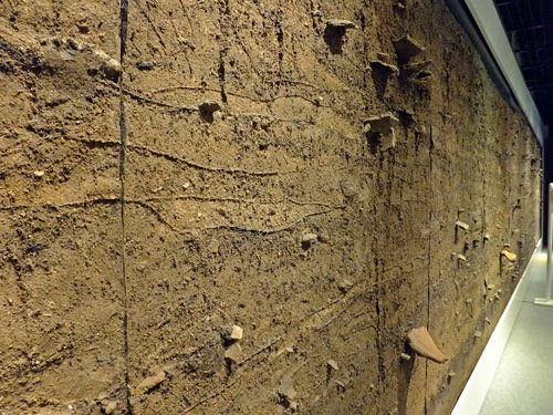 さっき中ではがしてきた跡を見た「南盛土」の実際の断面。中を通ることはできませんが、柵越しに見ることができます。