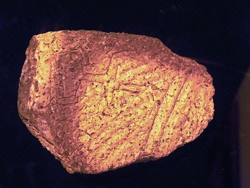 土器の破片に人間の形が掘りこまれてますが、元々この時代は模様といえば縄目で人間は土偶、動物たちもそういう形状を真似たものがほとんどで、こうした線画自体が珍しい。