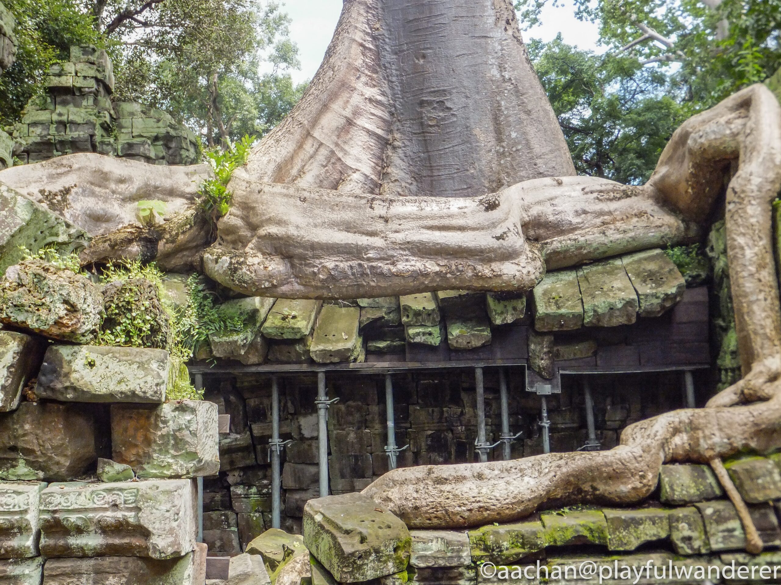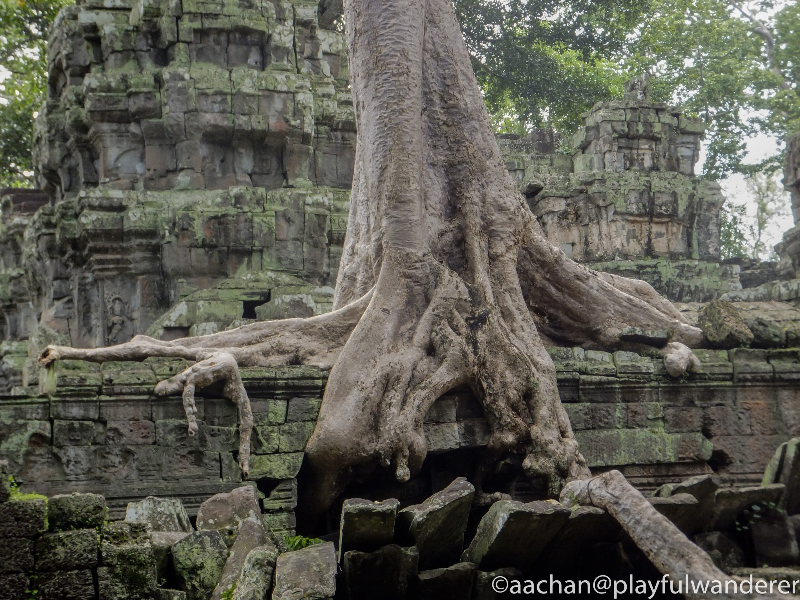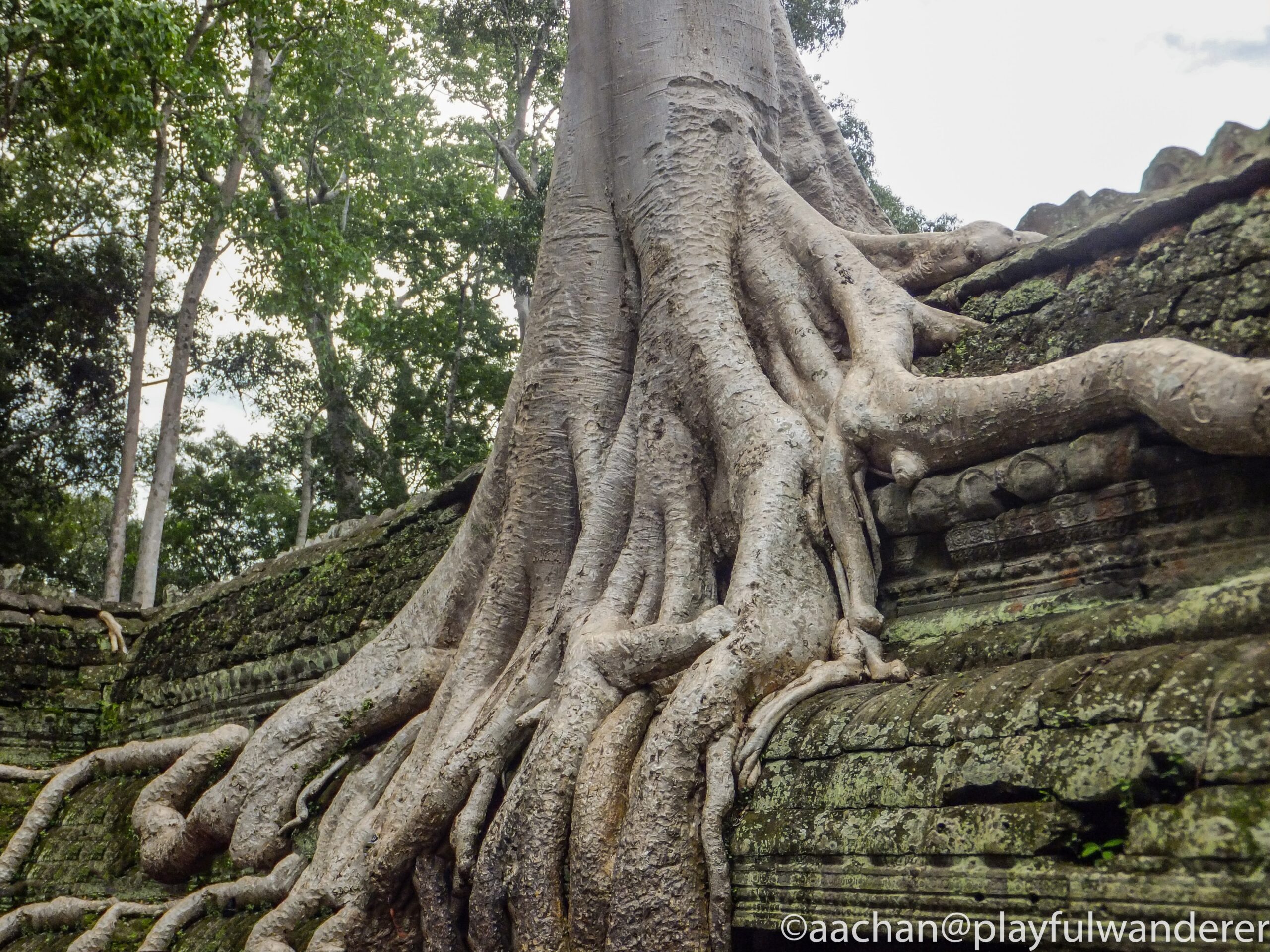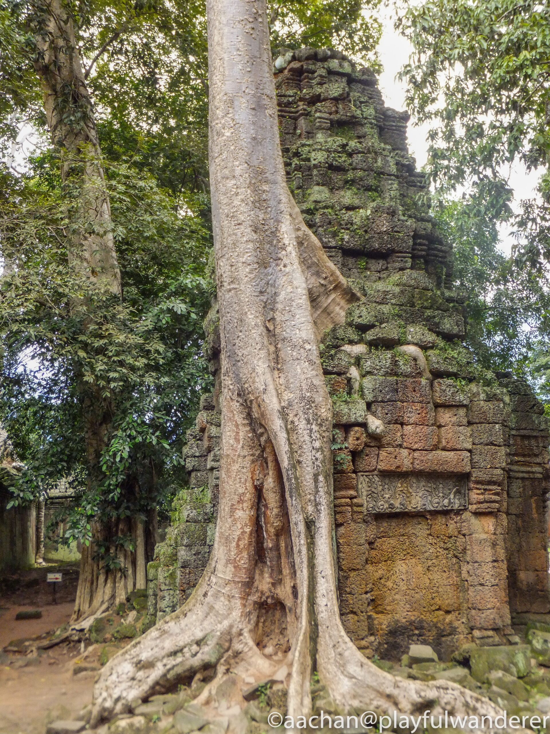 アンコール周辺の遺跡はどれも発見当時はジャングルの密林の中に埋もれていたそうだけど、ここの見所は発見当時の雰囲気を残して巨木に包み込まれるような様子が見られる。