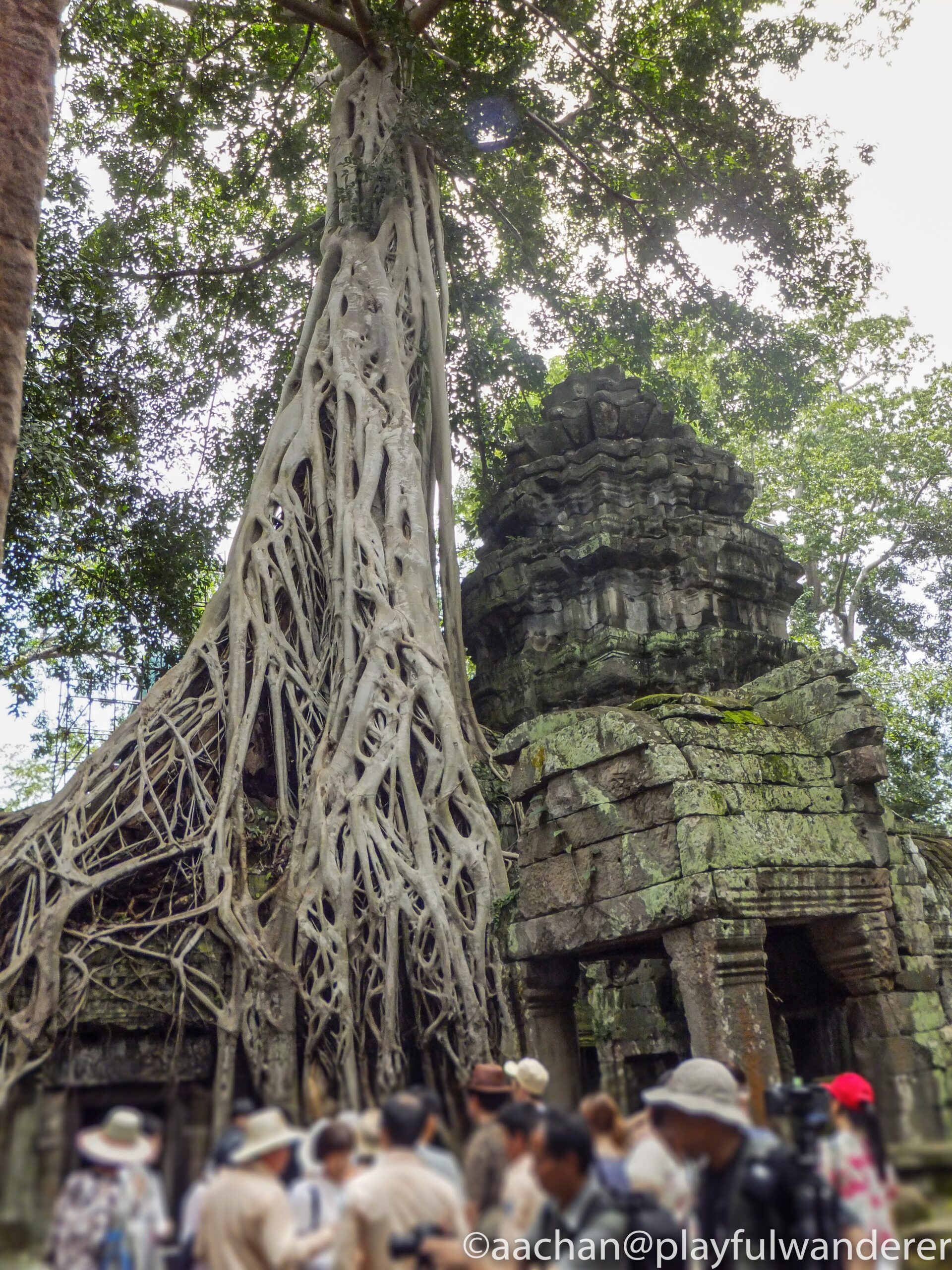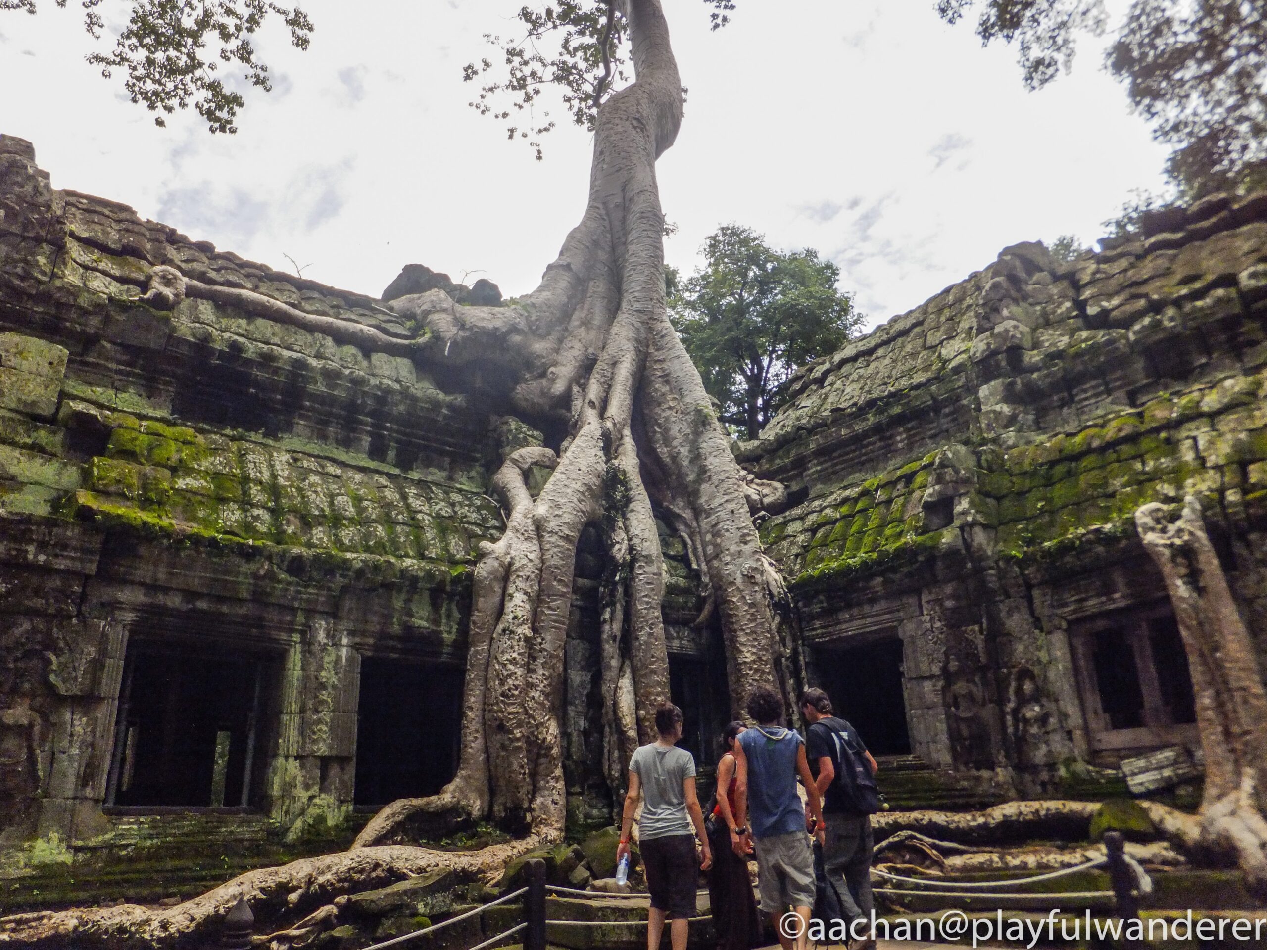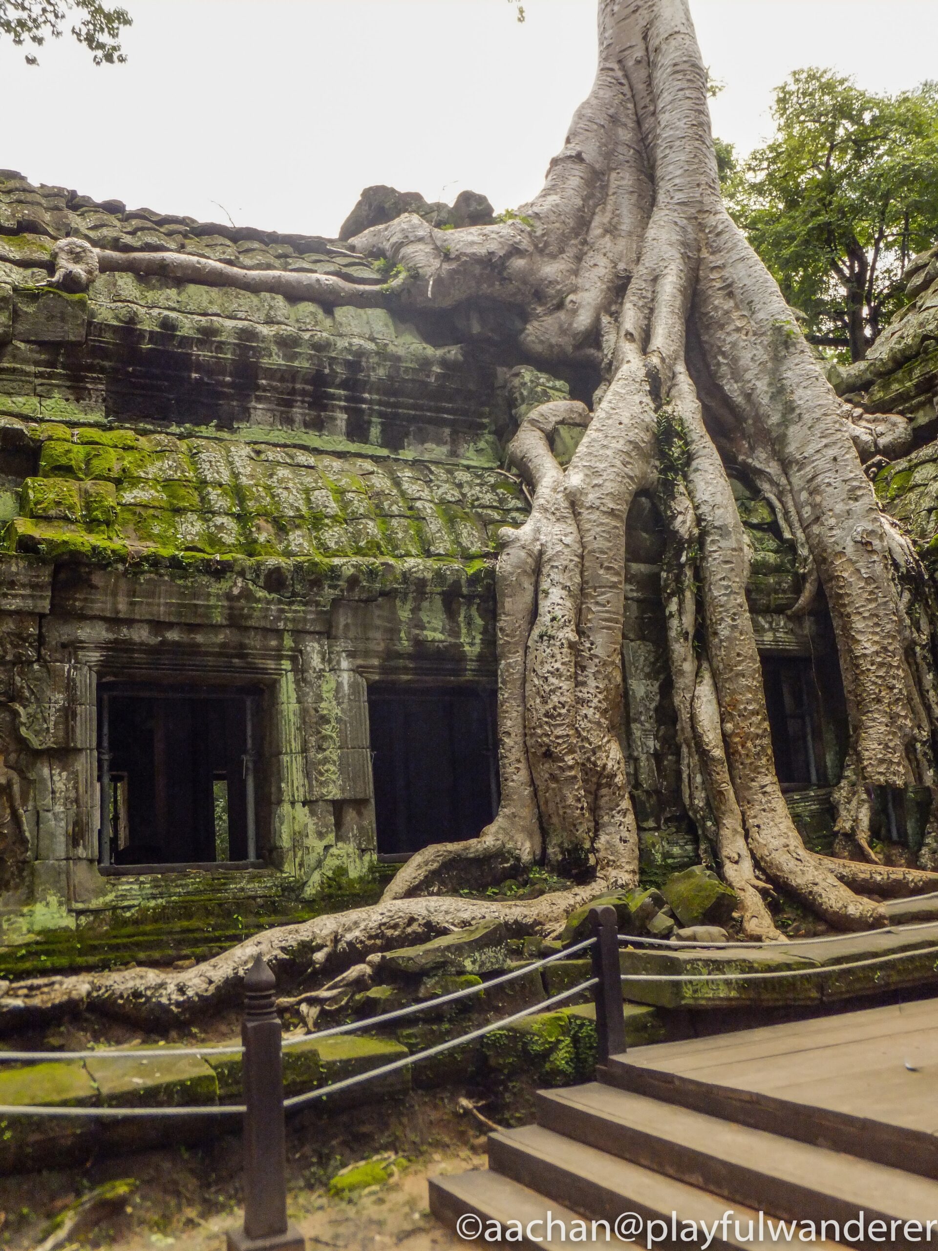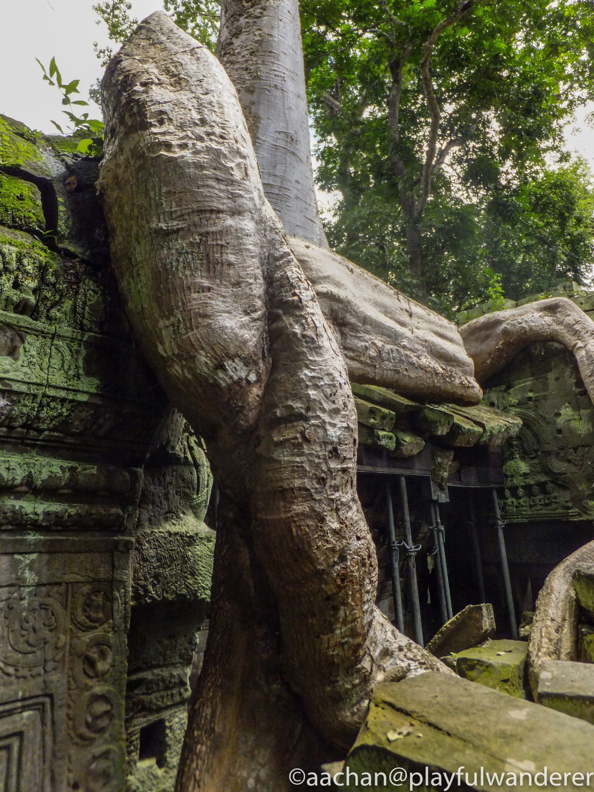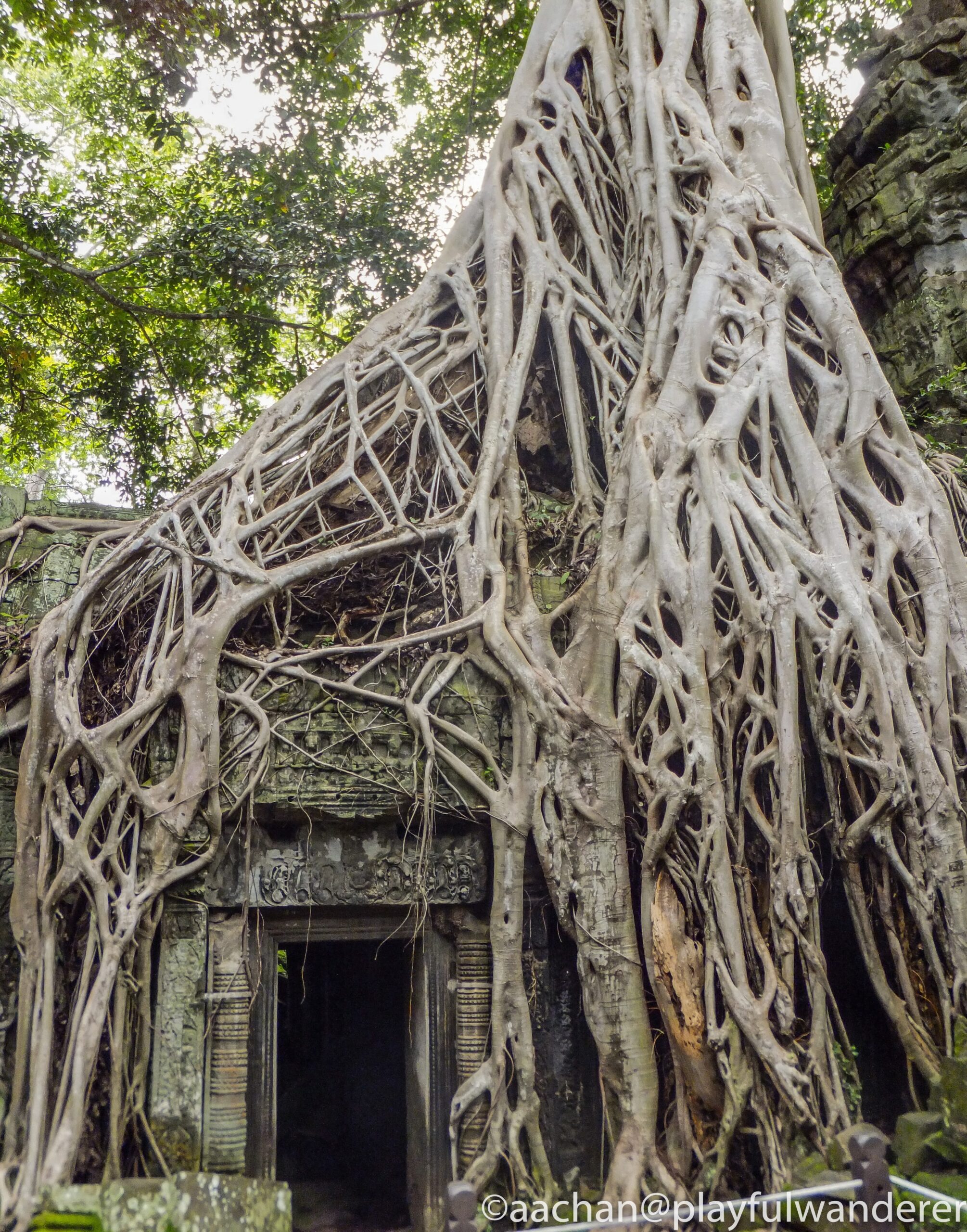 アンコール周辺の遺跡はどれも発見当時はジャングルの密林の中に埋もれていたそうだけど、ここの見所は発見当時の雰囲気を残して巨木に包み込まれるような様子が見られる。