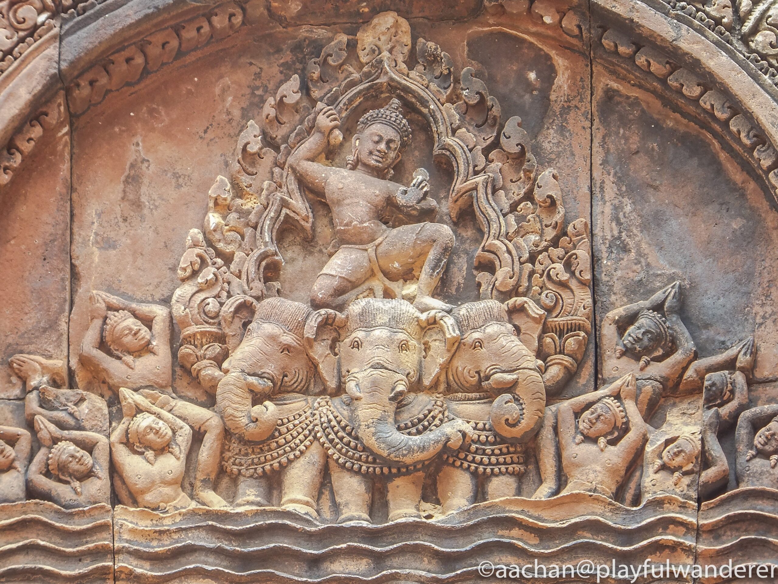 その上では、インドラ神が翼と複数の頭を持つ象アイラーヴァタにまたがって雨を降らせてます。