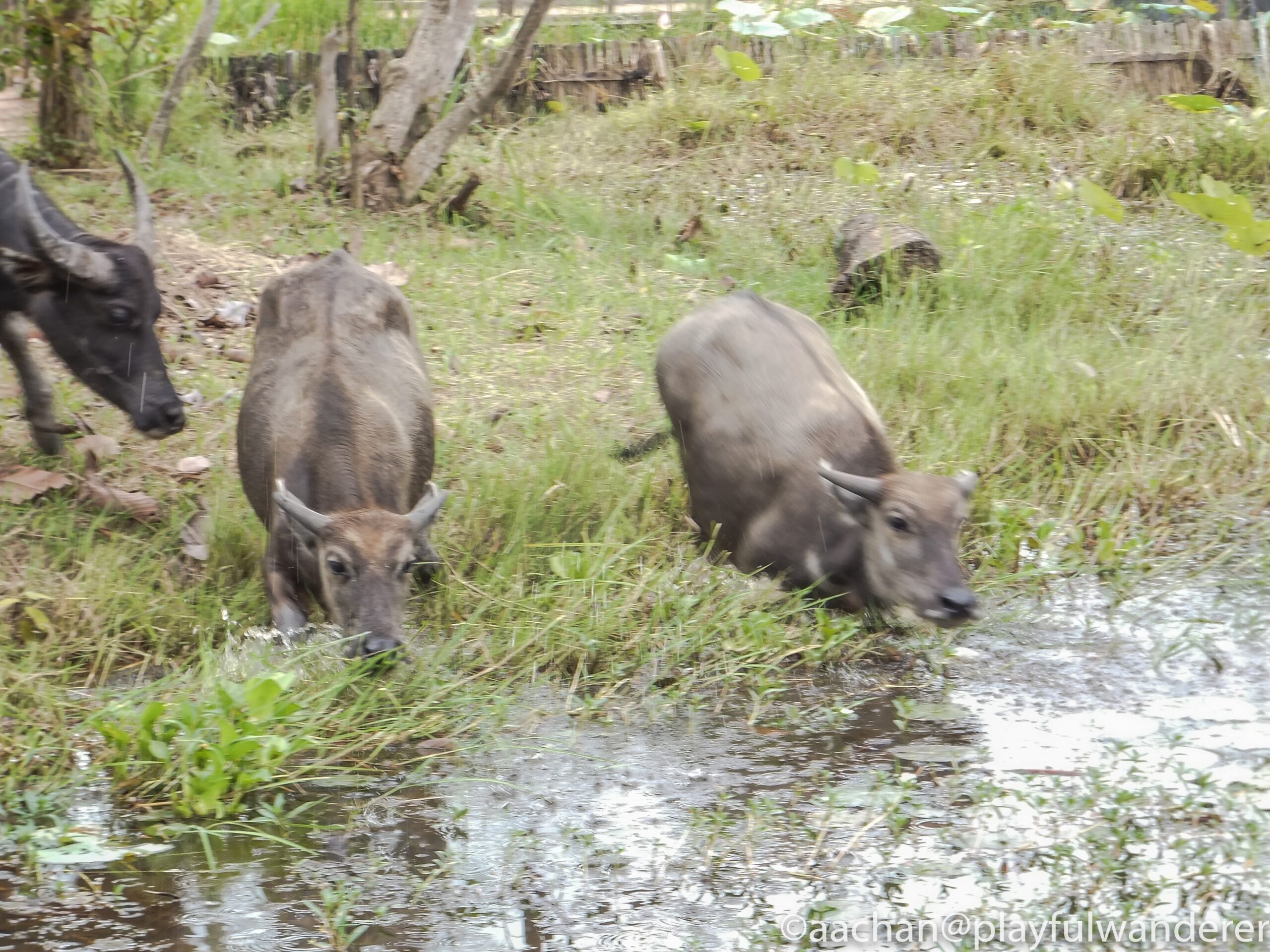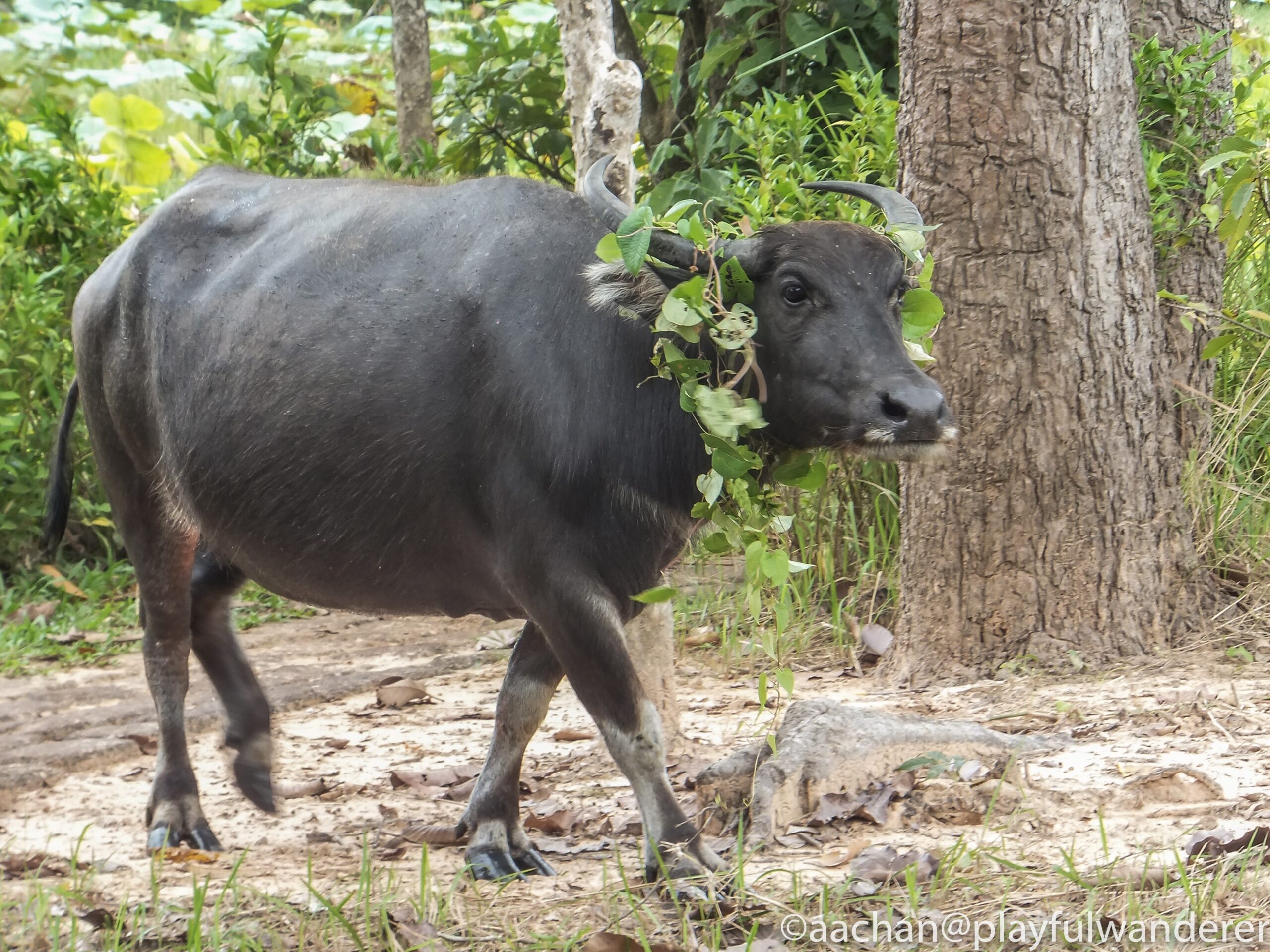 全部見終わって、参道を駐車場へ向かう途中、どこからか水牛が登場!!ほんと目の前をうろついてます。