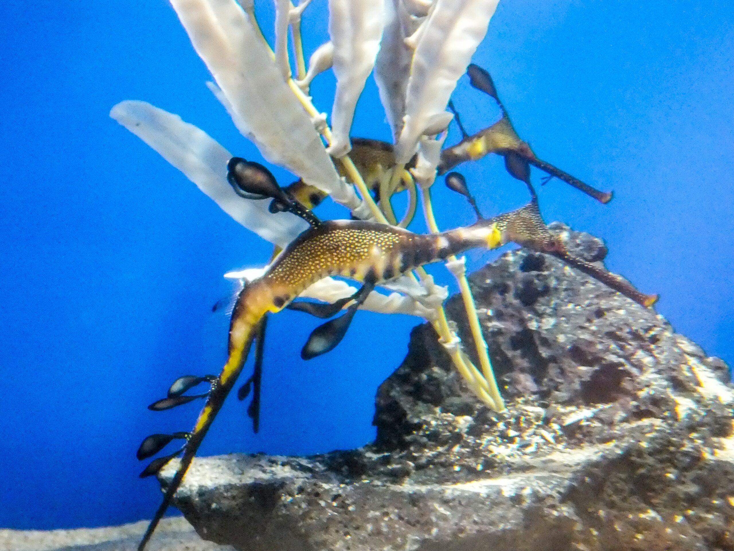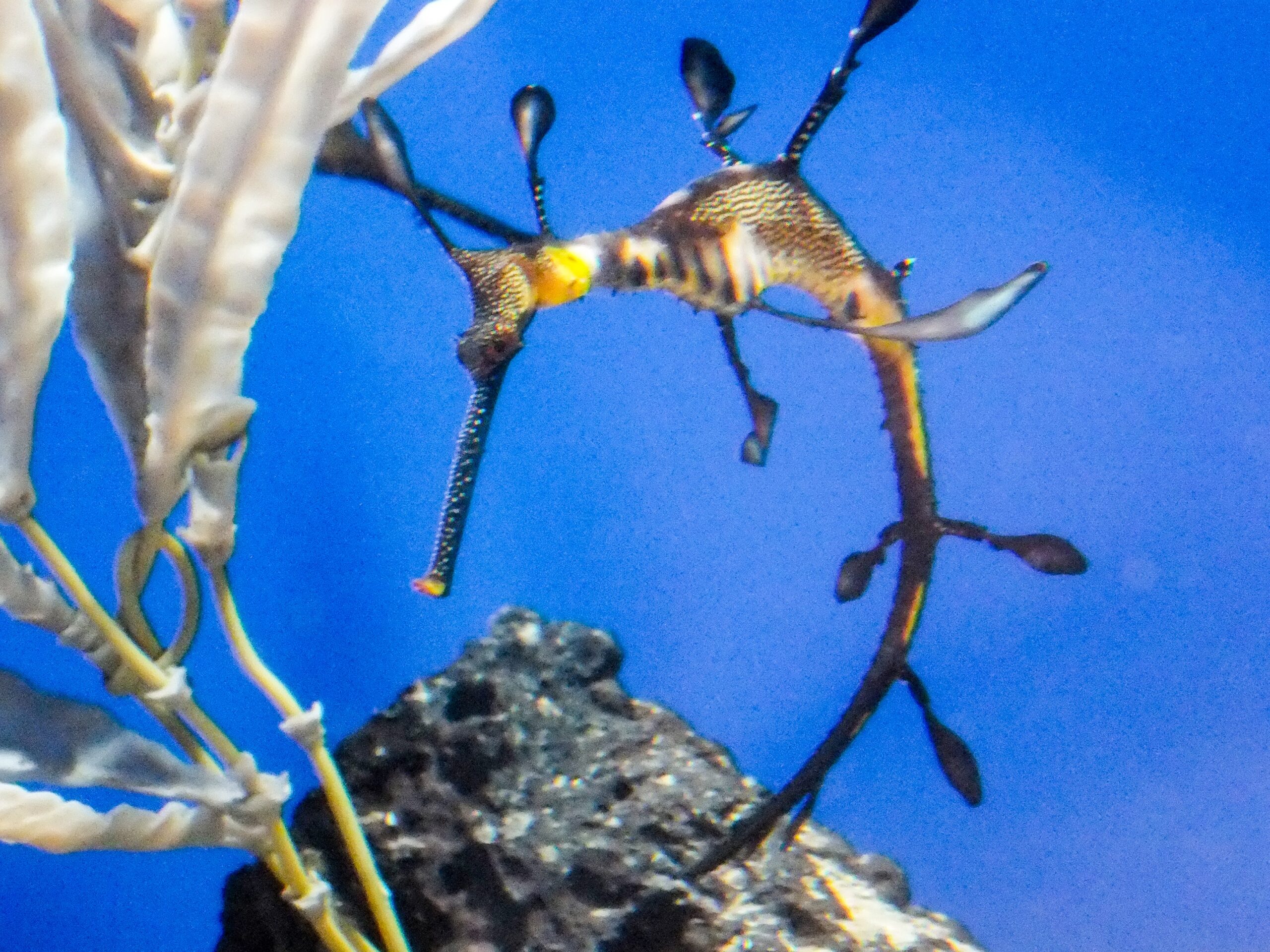 タツノオトシゴの仲間で、ただよう海藻みたいなリーフィーシードラゴン。この仲間も好きでつい張り付いてしまう。