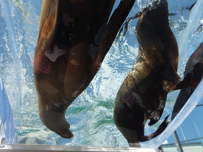 ちょっと近すぎてわかりにくいですが、透明な水槽に揺れる波紋と滑るように通過するアシカのお腹が涼しげ。